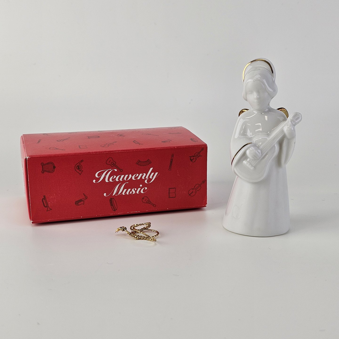 Figur med motiv af en engel som spiller på guitar. Figuren er i hvidt porcelæn med forgyldte vinger og detaljer i 24 karat guld.