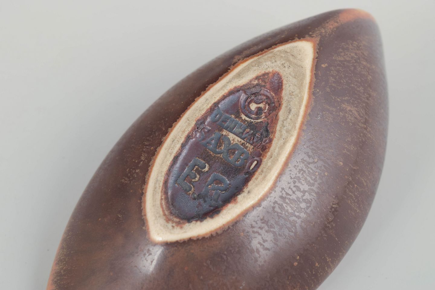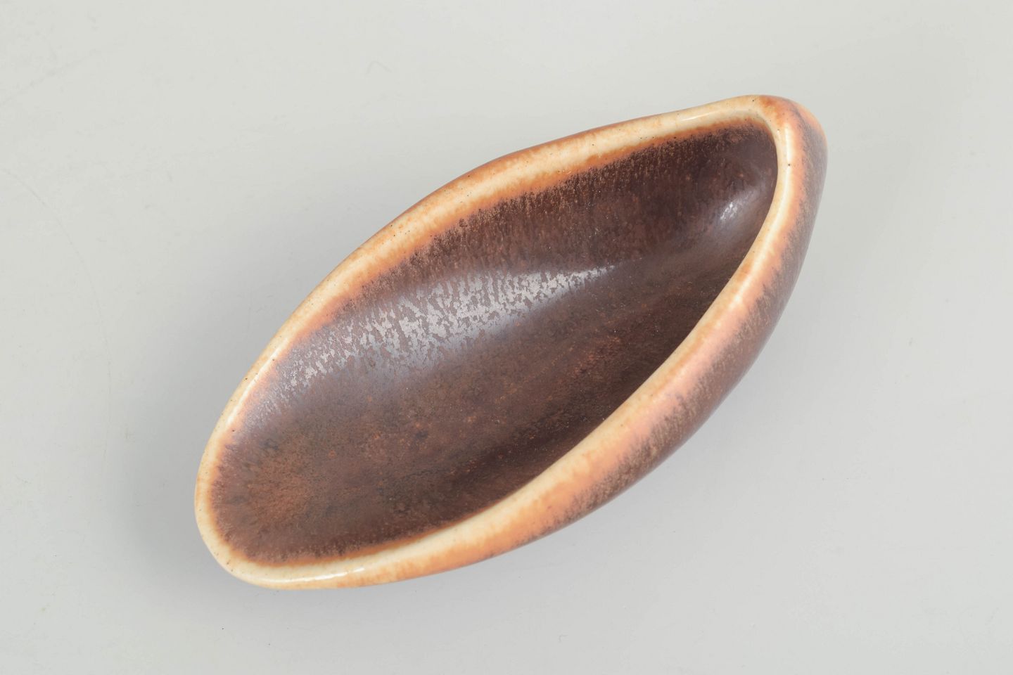 Organisk formet stentøjsskål med blødt afrundet kant og varm brun glasur med subtile nuancer i beige og rav. Et elegant eksempel på Saxbos karakteristiske kombination af enkle linjer og raffineret glasurarbejde.