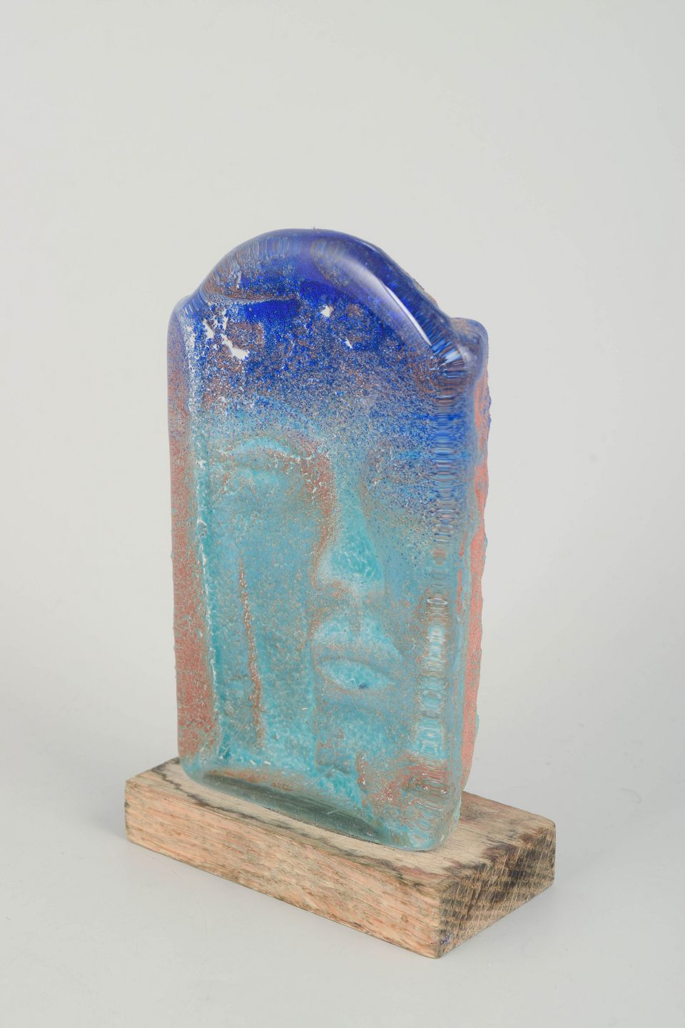 Unika, håndlavet glasskulptur med stiliseret ansigt, udført i massiv glas med iriserende overflade i blå, turkis og rosa toner. Monteret på træfod. Et karakteristisk eksempel på Ekegrens eksperimenterende arbejde med farve og struktur i glas fra 1980’erne.
