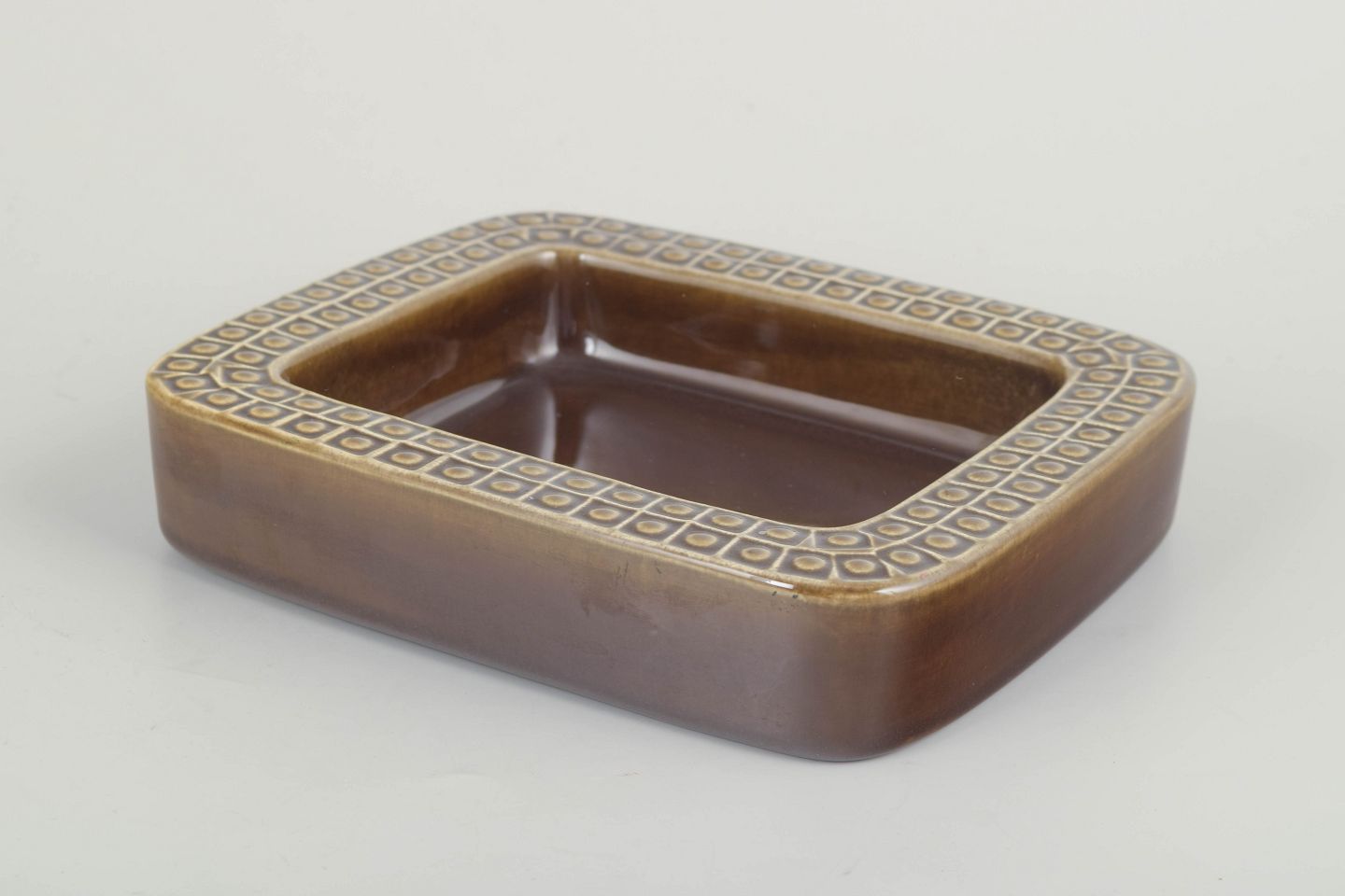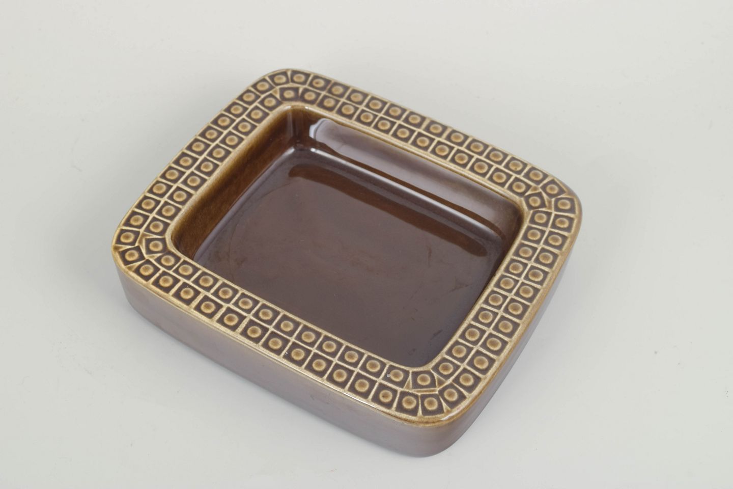 Keramisk skål i brun glasur med karakteristisk geometrisk reliefmønster langs kanten. Serien Kub forener funktionalisme og modernistisk elegance, og dette design er et fint eksempel på Nylunds sans for proportioner og materialefølelse.