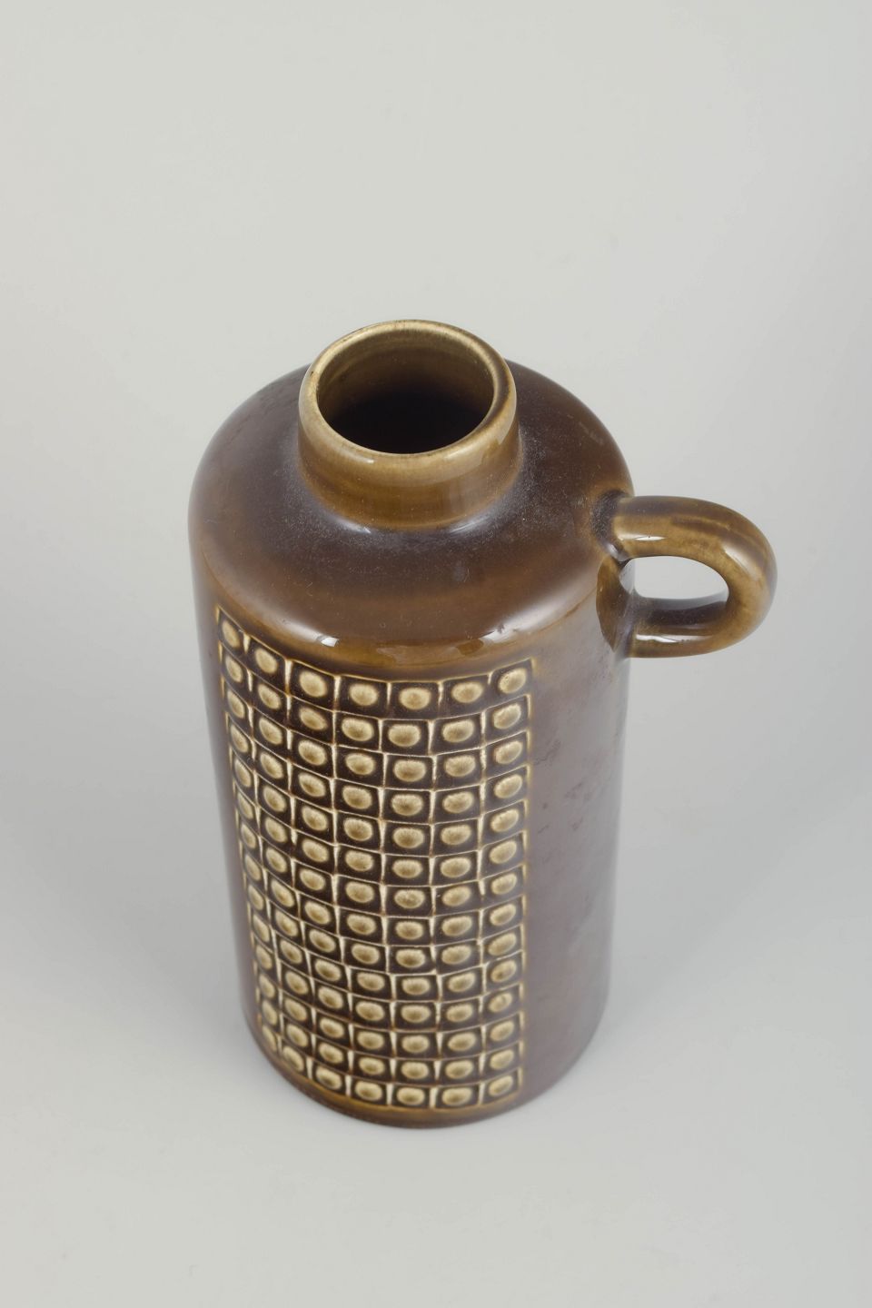 Elegant keramisk kande i brun glasur med geometrisk reliefmønster i kubisk design. Serien Kub repræsenterer Nylunds modernistiske formsprog med fokus på funktion, struktur og tidløs æstetik.