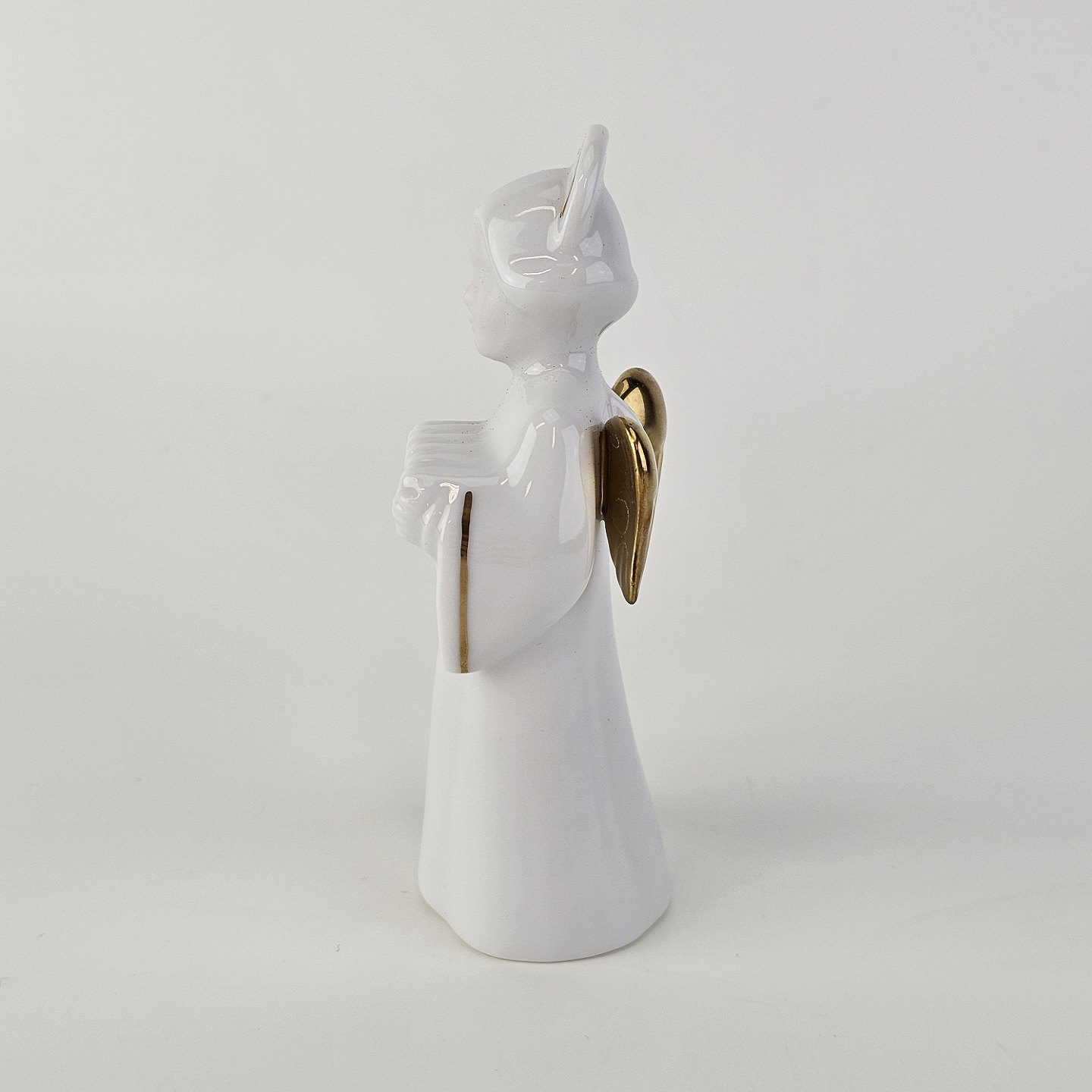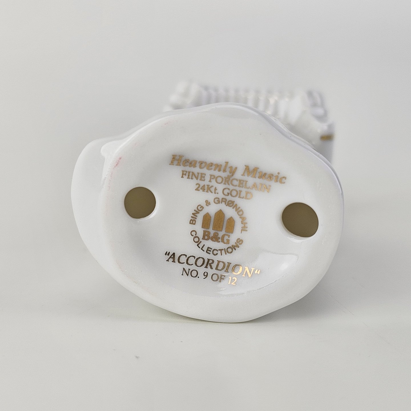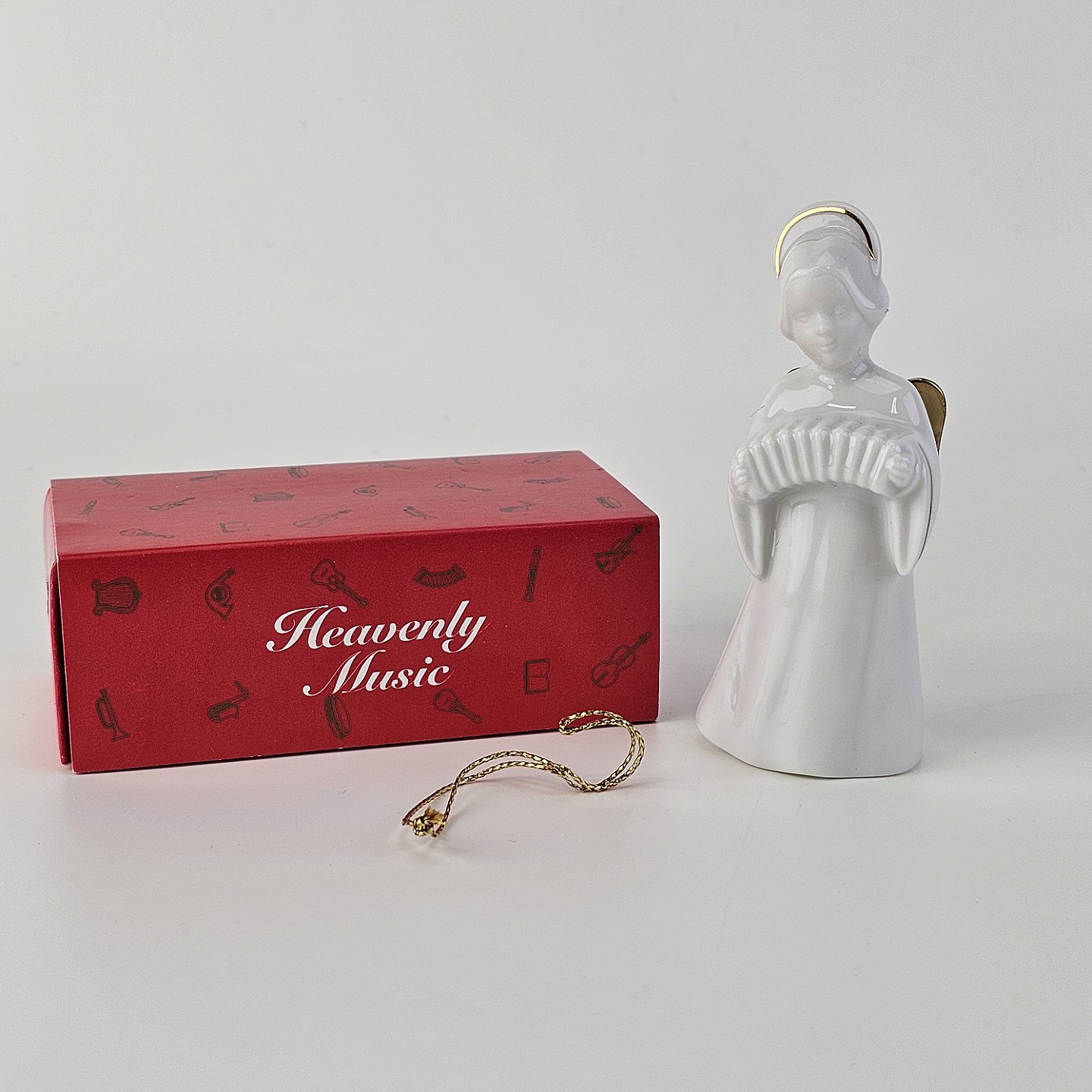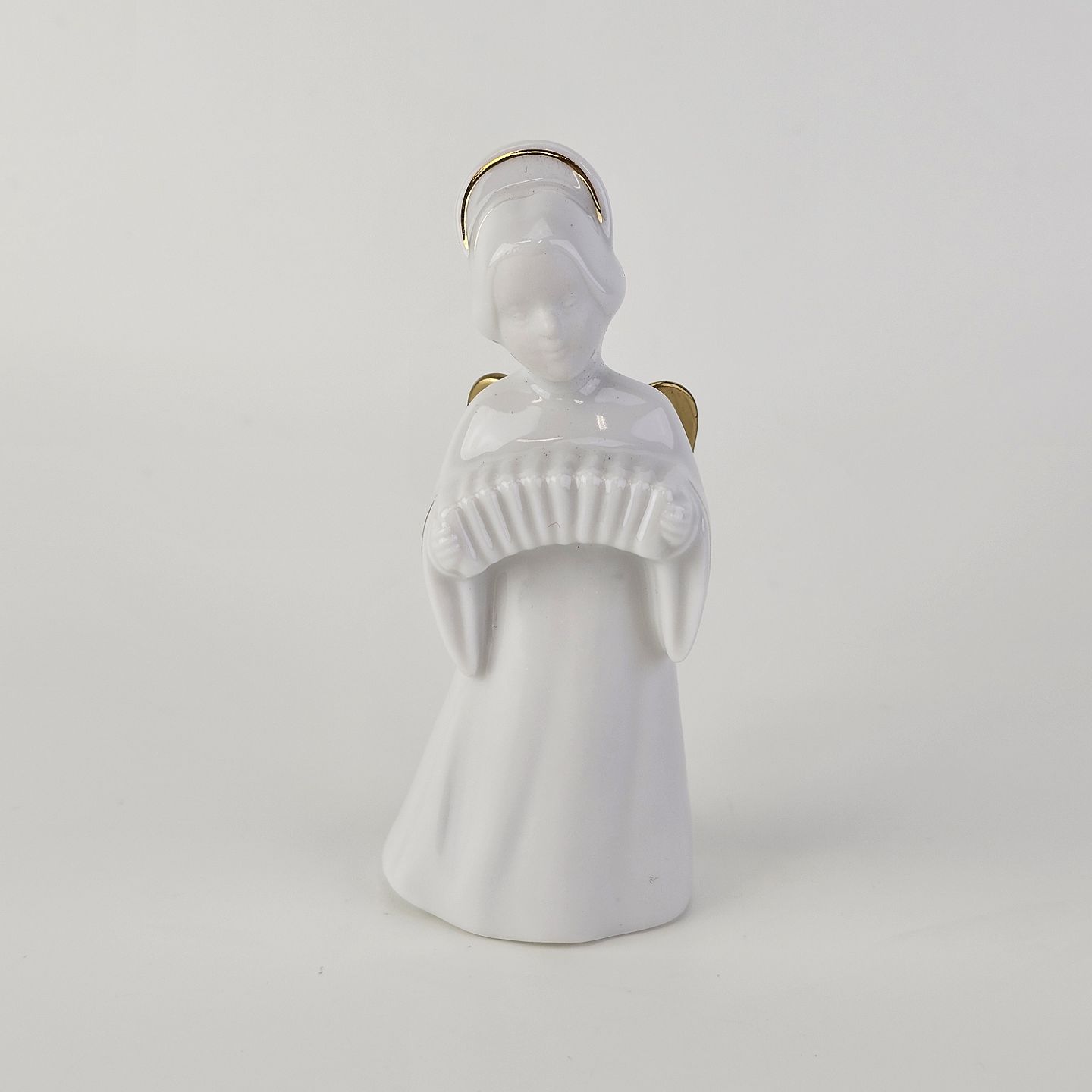 Figur med motiv af en engel som spiller på harmonika. Figuren er i hvidt porcelæn med forgyldte vinger og detaljer i 24 karat guld.