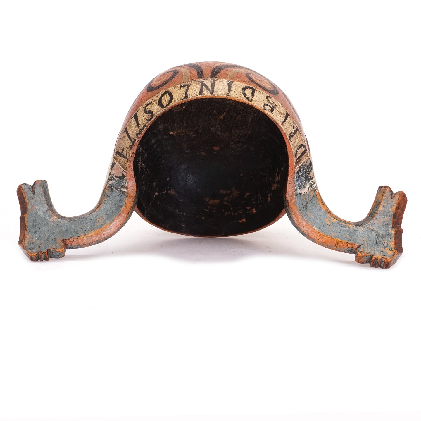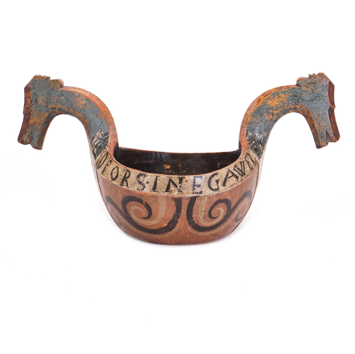 Norwegian early 19th century wood cut drinking bowl dated 1803. H: 21cm. L: 41cm