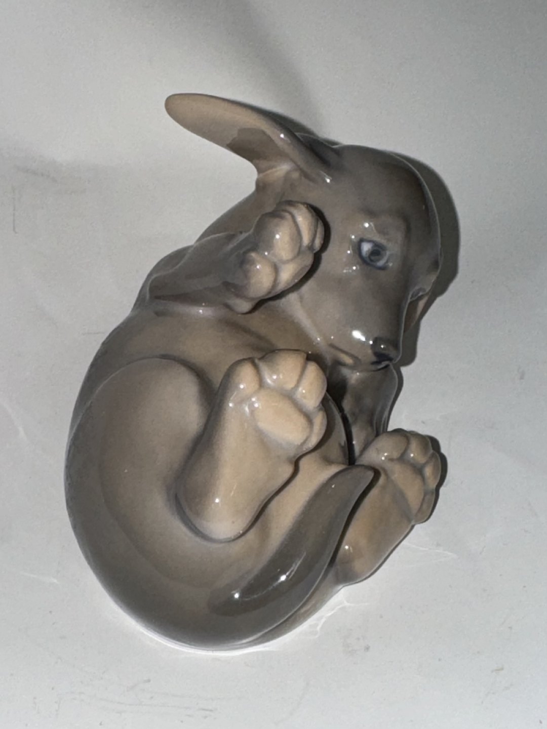 CHARMERENDE FIGUR AF LILLE HUND: Royal Copenhagen, Gravhund. Designet af Oluf Mathiesen. Modelnummer 1408, 1. sortering. Fremstår i god stand. Fabriksmærket på bunden. 11 cm lang.