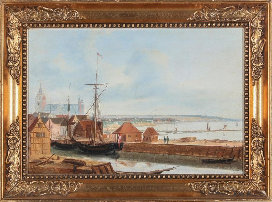 Holm, Peter (1798 - 1875) Danmark: Scene fra Aarhus Havn med udsigt til Domkirken. Signeret : PH. Olie på metalplade. 18 x 26 cm.