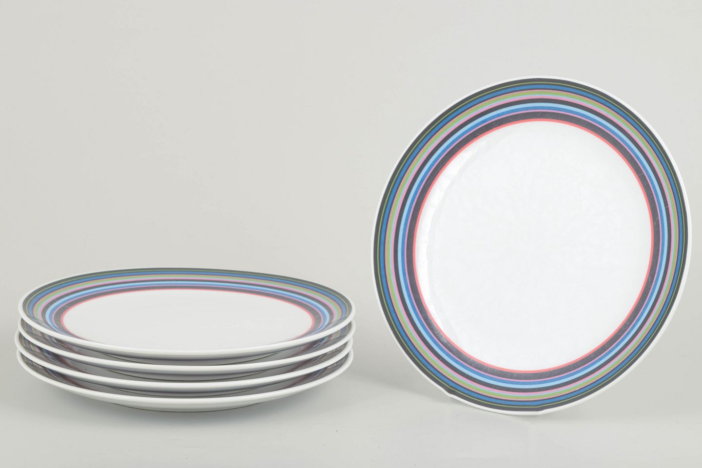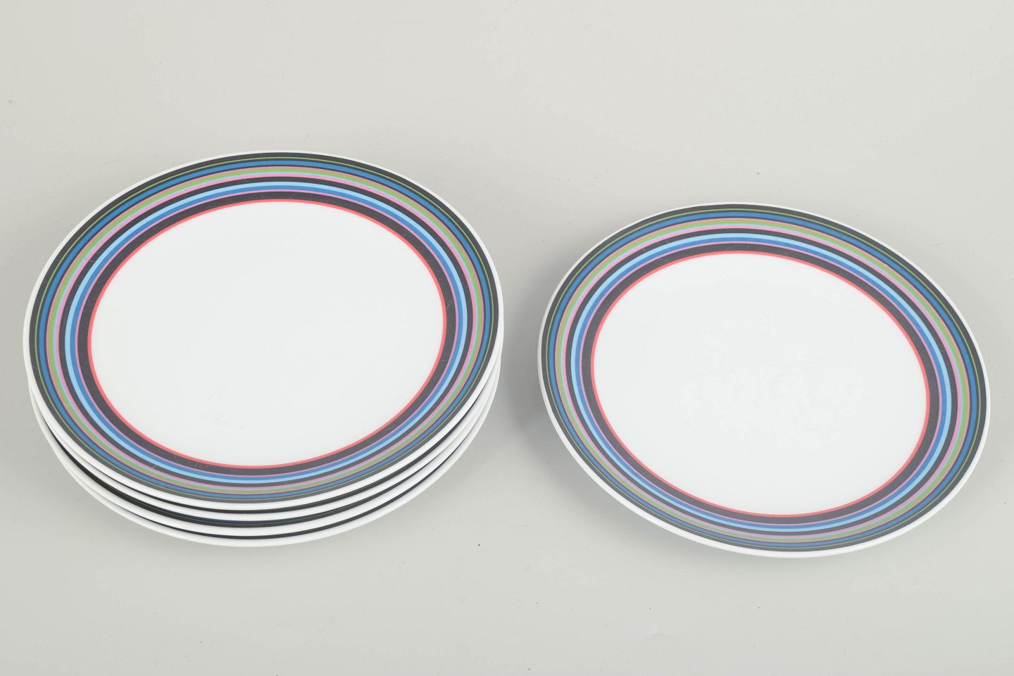 Sæt med fem tallerkener i porcelæn med det karakteristiske flerfarvede stribemønster designet af Alfredo Häberli for Iittala. Serien forener funktionalitet med legende farver og tidløst formsprog, der har gjort den til en moderne klassiker i nordisk design.