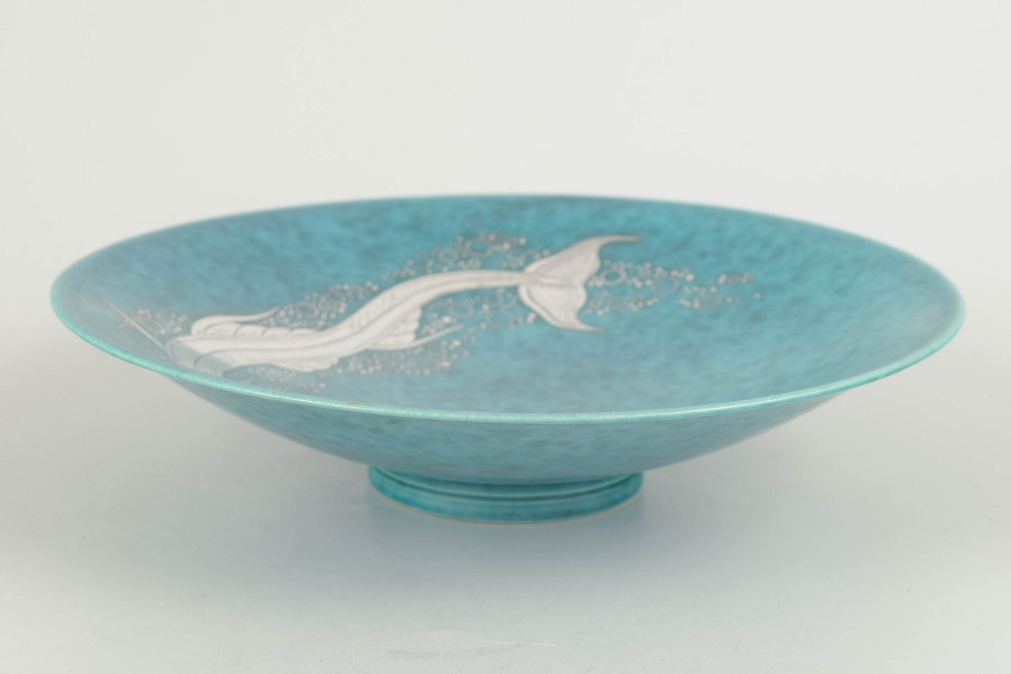 Lav skål i turkisgrøn glasur med sølvindlagt motiv af fisk i bevægelse. Et klassisk eksempel fra Kåges berømte Argenta-serie, hvor den metalliske sølvdekoration elegant kontrasterer den dybe grønblå glasur.
