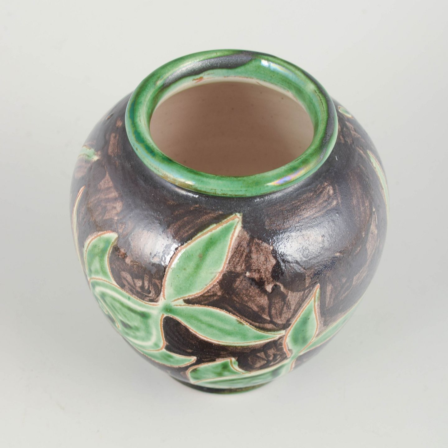 Dekorativ vase i glaseret lertøj med reliefdekoration forestillende fisk og tang i grønne og brune nuancer. Et karakteristisk eksempel på dansk midt-århundredes værkstedsproduktion med naturinspirerede motiver og livlig farvekontrast.