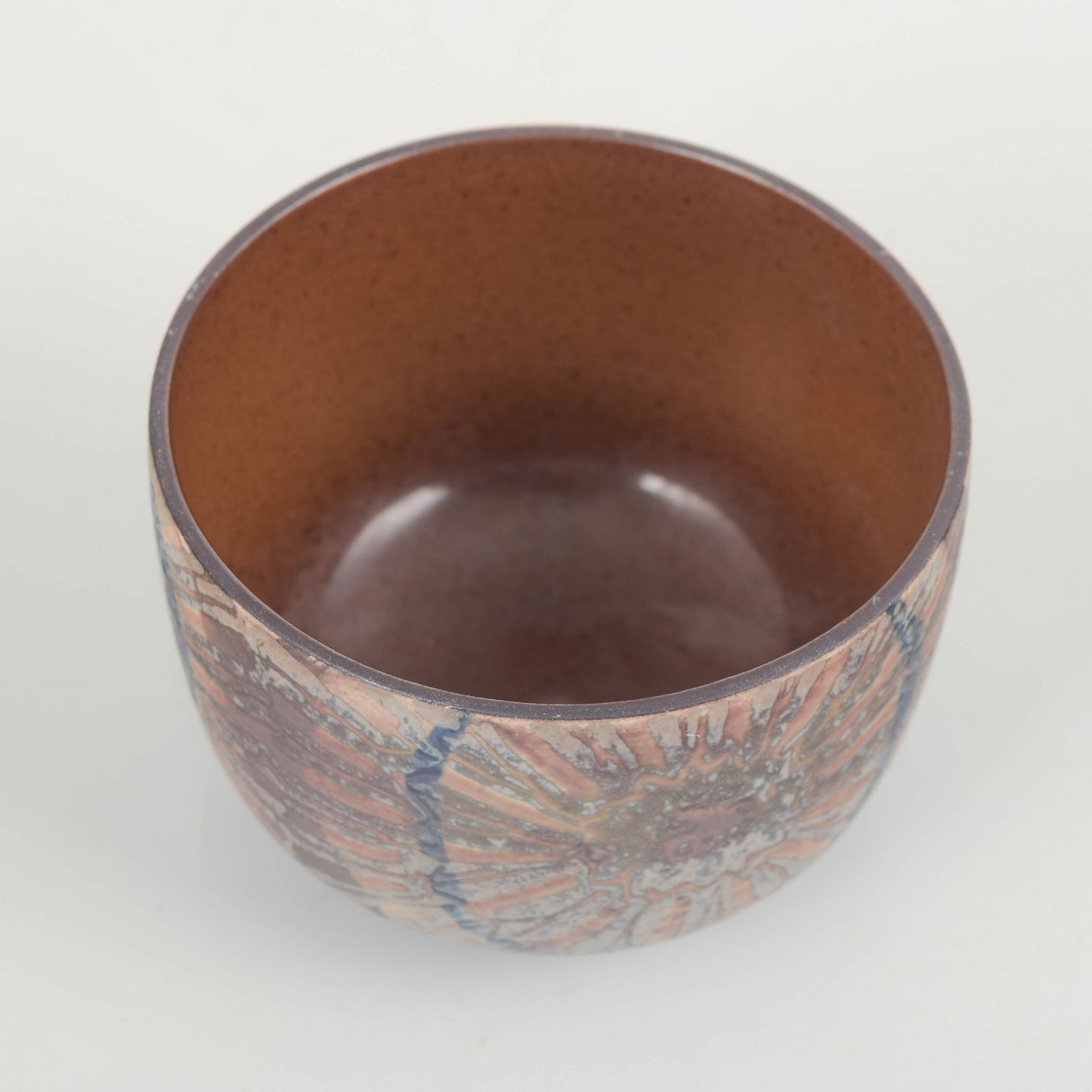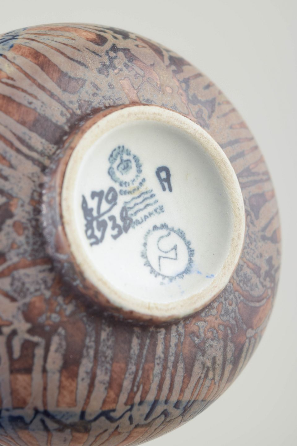 Dekorativ skål i stentøj med karakteristisk hånddekoreret glasur i blå, brunlige og lyse toner, udført i relief med organisk solmotiv. Et typisk eksempel på Thorssons arbejde for Royal Copenhagen i perioden, hvor han eksperimenterede med tekstur og naturinspirerede mønstre.