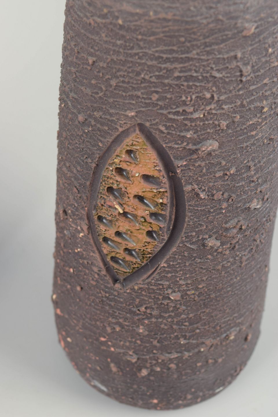 To håndlavede flaskelignende vaser i chamotte-ler med reliefdekoration og indlagte felter af farvet glasur i turkis, grønne og brunlige nuancer. Typisk for Tilgmans’ rustikke stil med stærk tekstur og geometrisk ornamentik.