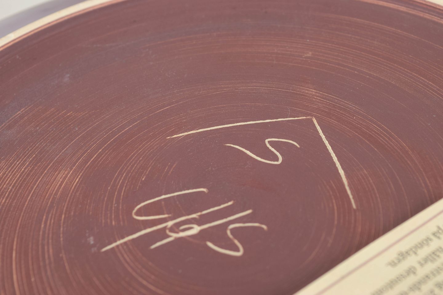 Hånddrejet stentøjsfad med eksperimentel flerfarvet glasur i vinrøde, rosa og blålige toner. Overfladen prydes af et frit ornamentalt mønster i typisk Stålhane-stil, hvor glasuren danner en levende, reliefagtig struktur med høj glans. Et markant eksempel på Stålhånes sene arbejde for Designhuset.