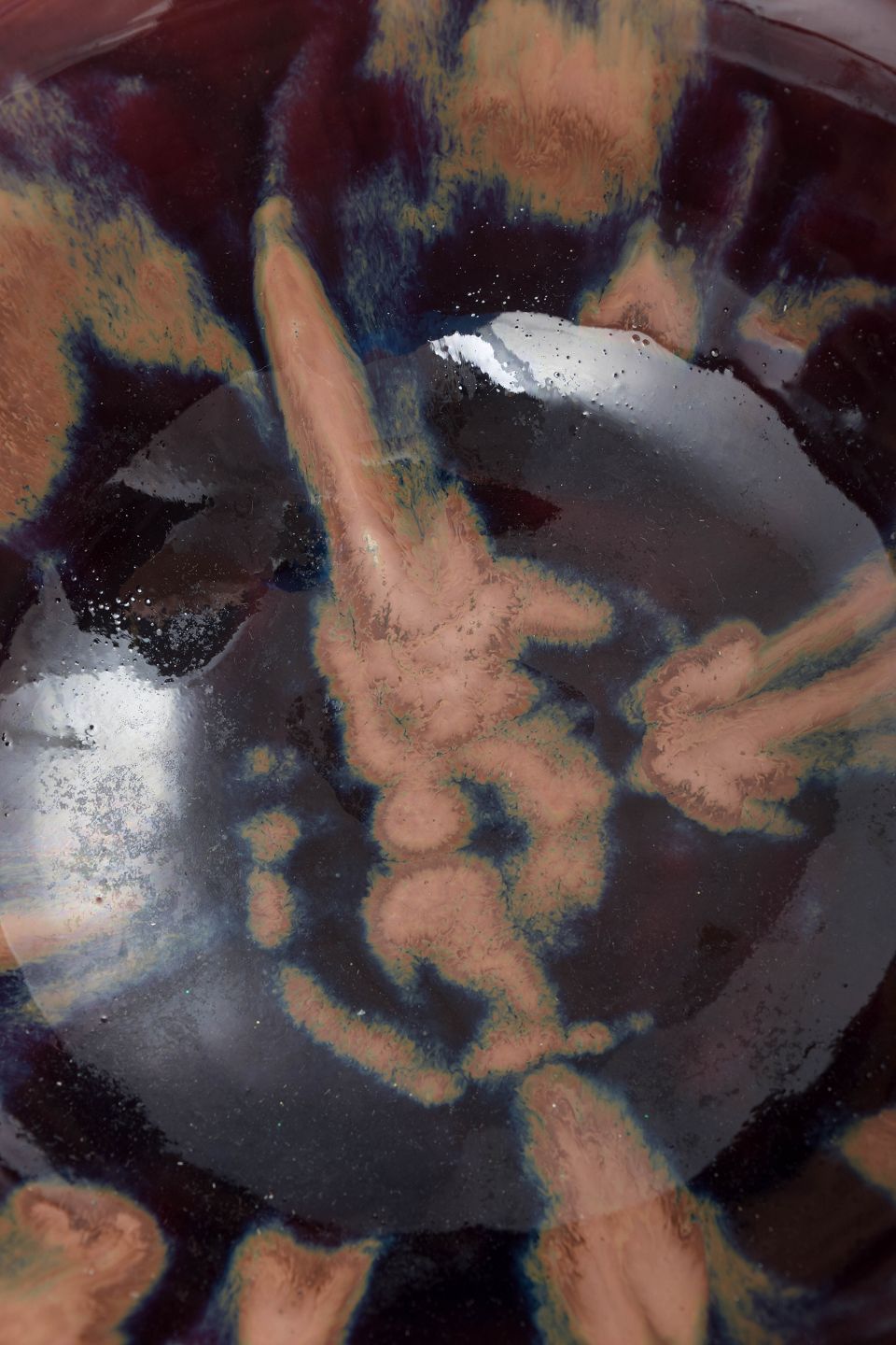 Elegant, hånddrejet stentøjsskål med løstsiddende form og blank, flerfarvet glasur i nuancer af dyb vinrød, blå, sort og kobbertoner, karakteristisk for Stålhånes eksperimenter med flydende glasurer i perioden efter Rörstrand.