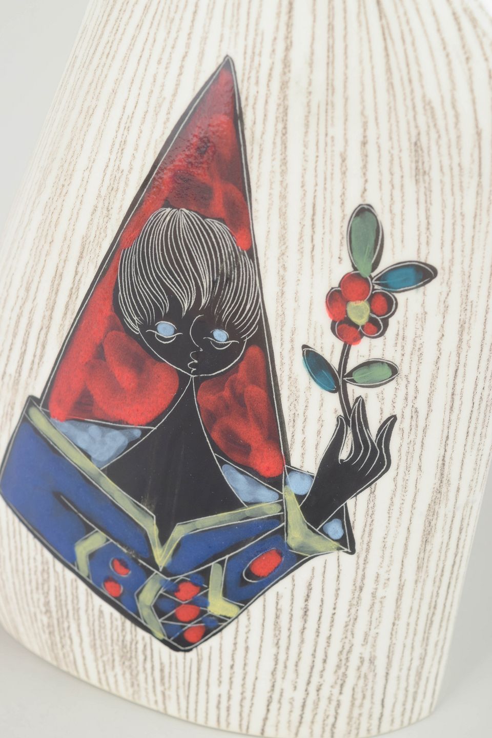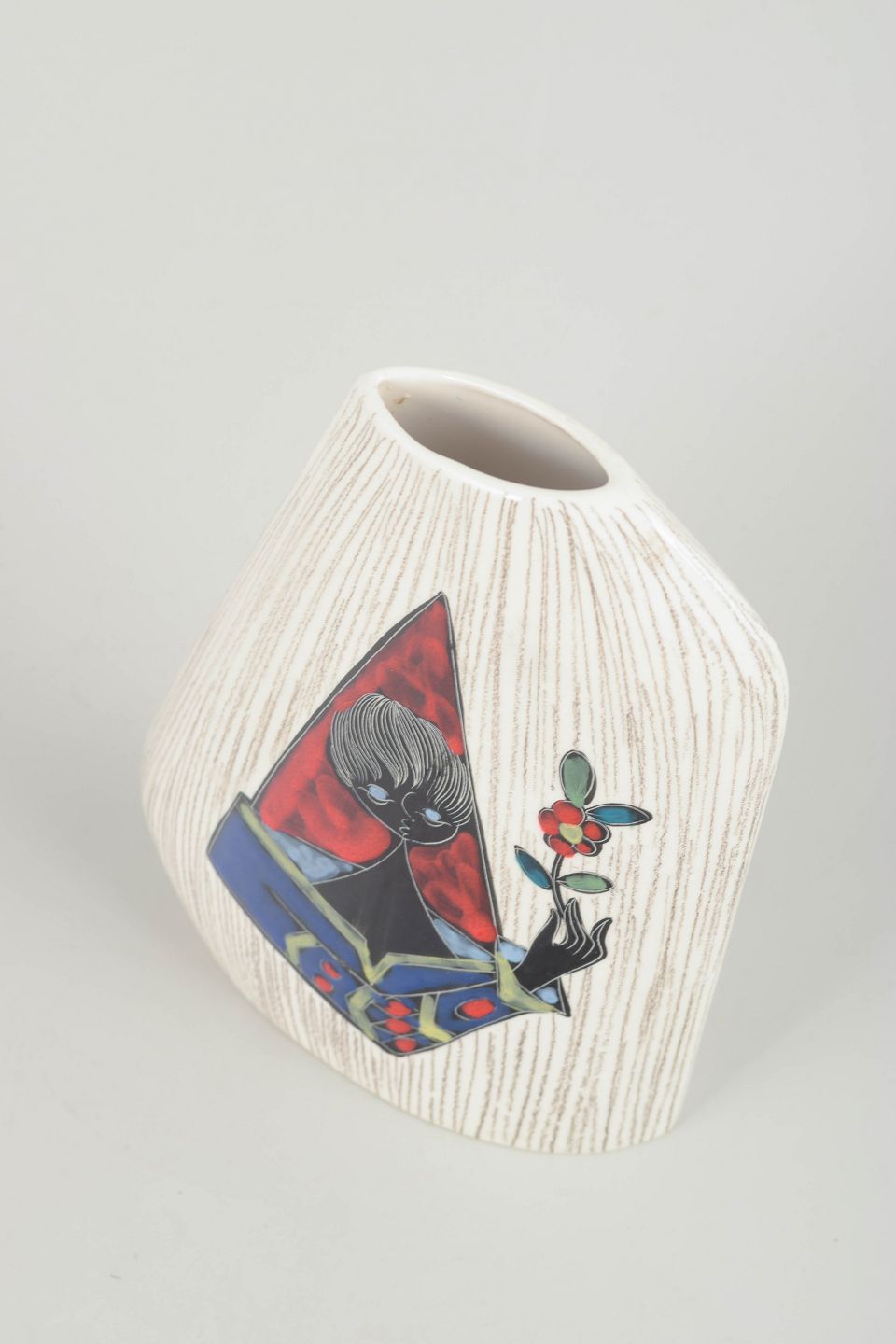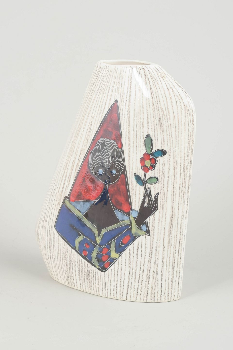 Håndlavet italiensk keramikvase med asymmetrisk, skråtformet krop og reliefdekoreret overflade i hvidglaseret ler. Fronten er udsmykket med et farverigt motiv af en stiliseret figur med blomst, udført i emalje og malet i rød, blå, grøn og sort. Signeret på undersiden. Et karakteristisk eksempel på italiensk 1960’er-keramik med kunstnerisk og grafisk udtryk.