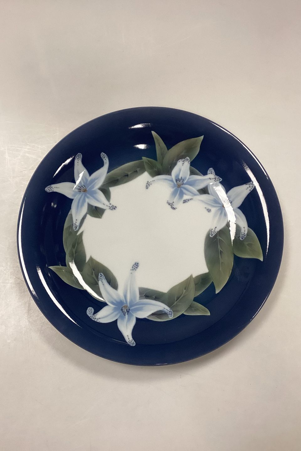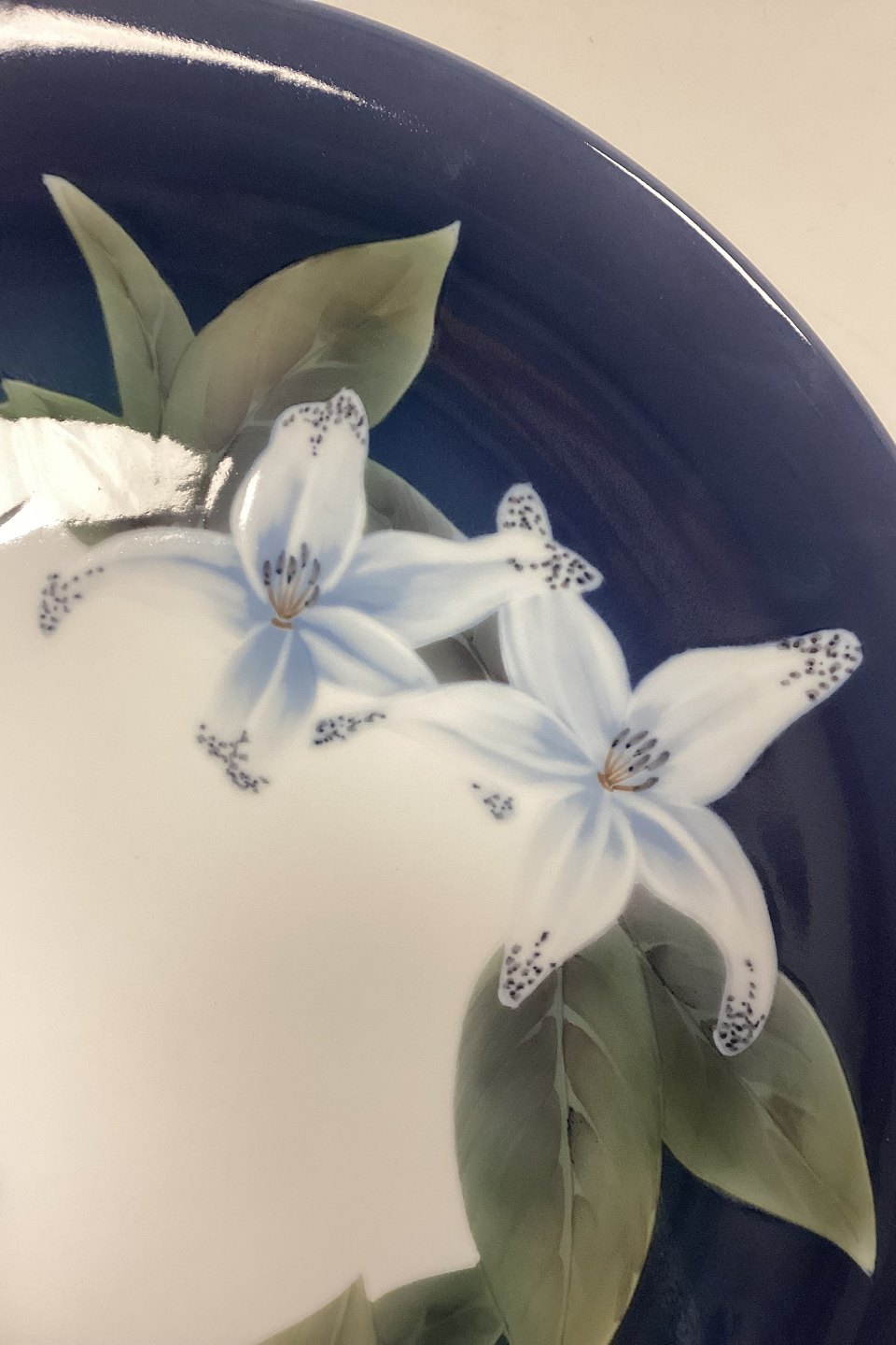 Royal Copenhagen Art Nouveau Fad No. 1063/646. Motiv med liljer på mørkeblå baggrund.