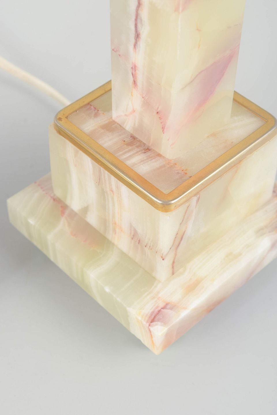Elegant par bordlamper i poleret onyx med naturlige årer i grønne, rosa og cremefarvede toner. Fod og top i messingdetaljer, monteret på små kugleben i glas. Klassisk italiensk design med tydelig reference til Volterras stenhuggertradition.