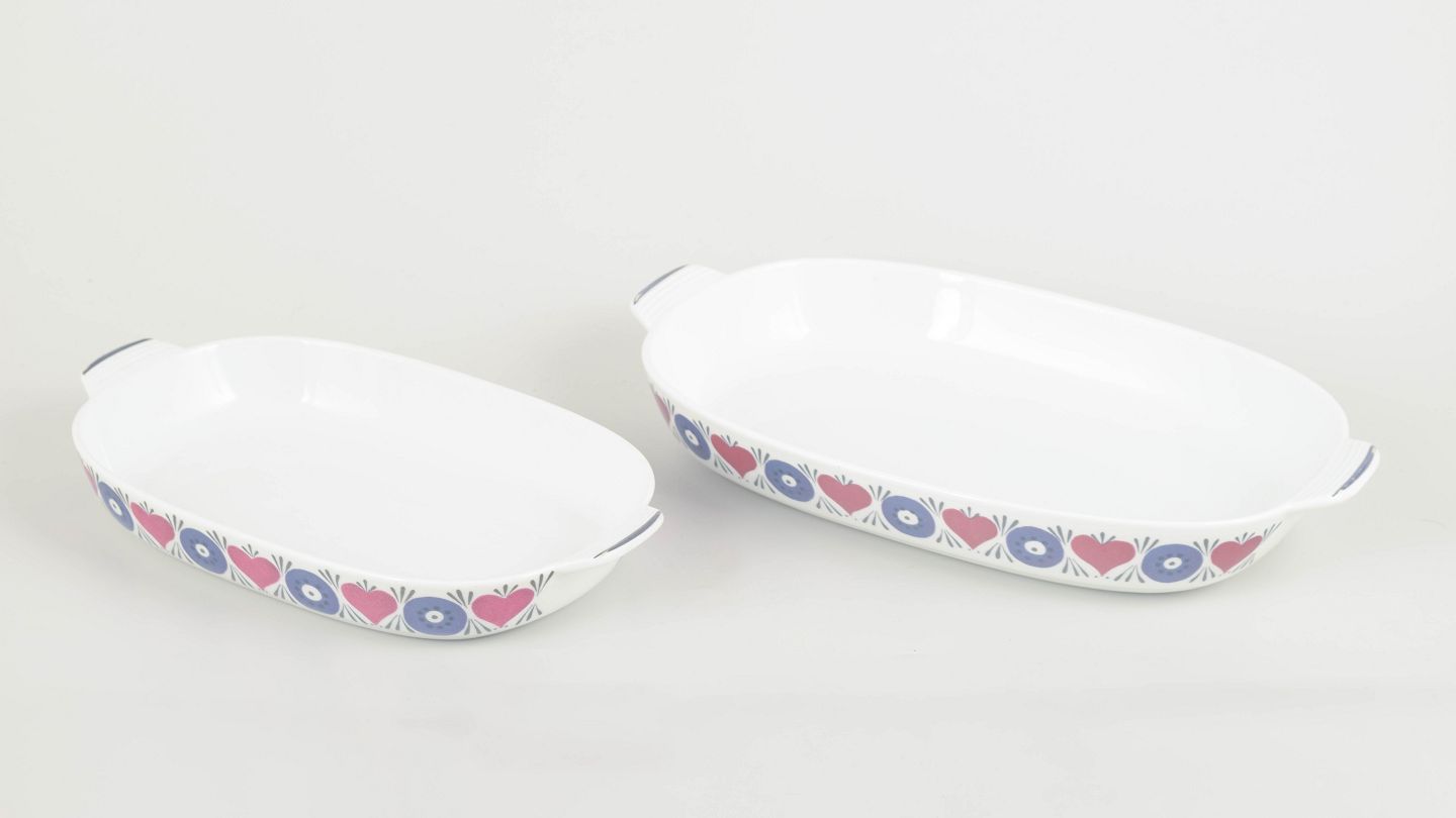 Dekoreret med Westmans karakteristiske retroblomstermotiv i blå og rosa på hvid bund. Serien Silja blev lanceret i 1960’erne som en del af Rörstrands funktionelle “El-Fast” stentøj, velegnet til både ovn og bord.