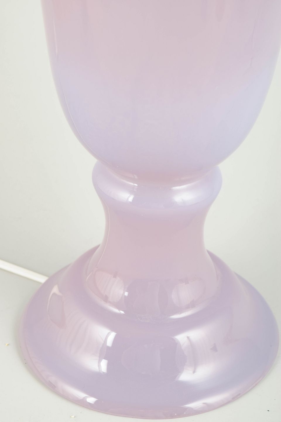 Elegant bordlampe i mundblæst glas med blød turkis/lilla tone og klassisk urneformet fod. Original fatning, ledning udskiftet senere.