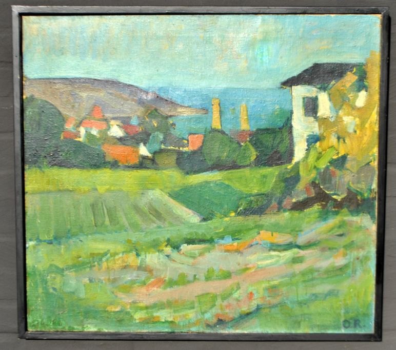 Dansk kunstner (20. årh.): Byparti - Bornholm. Olie på lærred. Signeret. O.R. 65 x 72 cm.