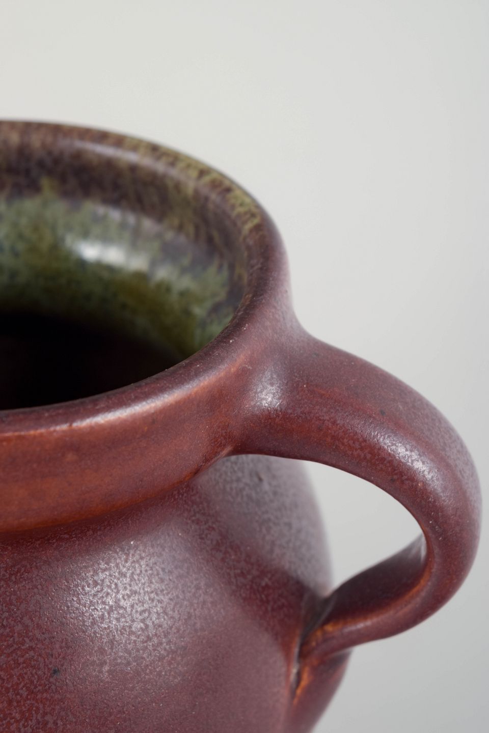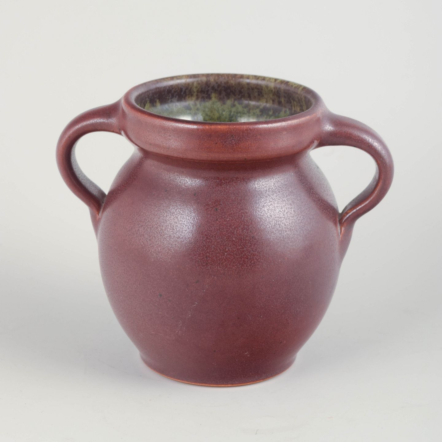 Hånddrejet stentøjsvase i dyb rødviolet glasur med let spil og smukt kontrasterende, flerfarvet indre glasur. Klassisk, blødt buet korpus med elegante dobbelthanke.