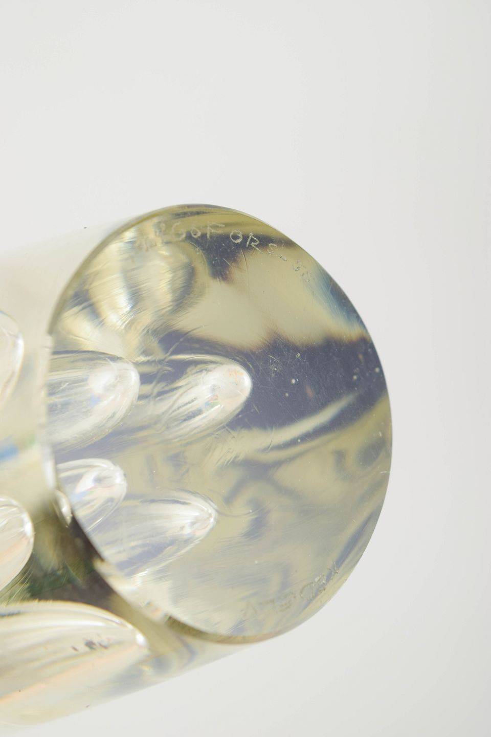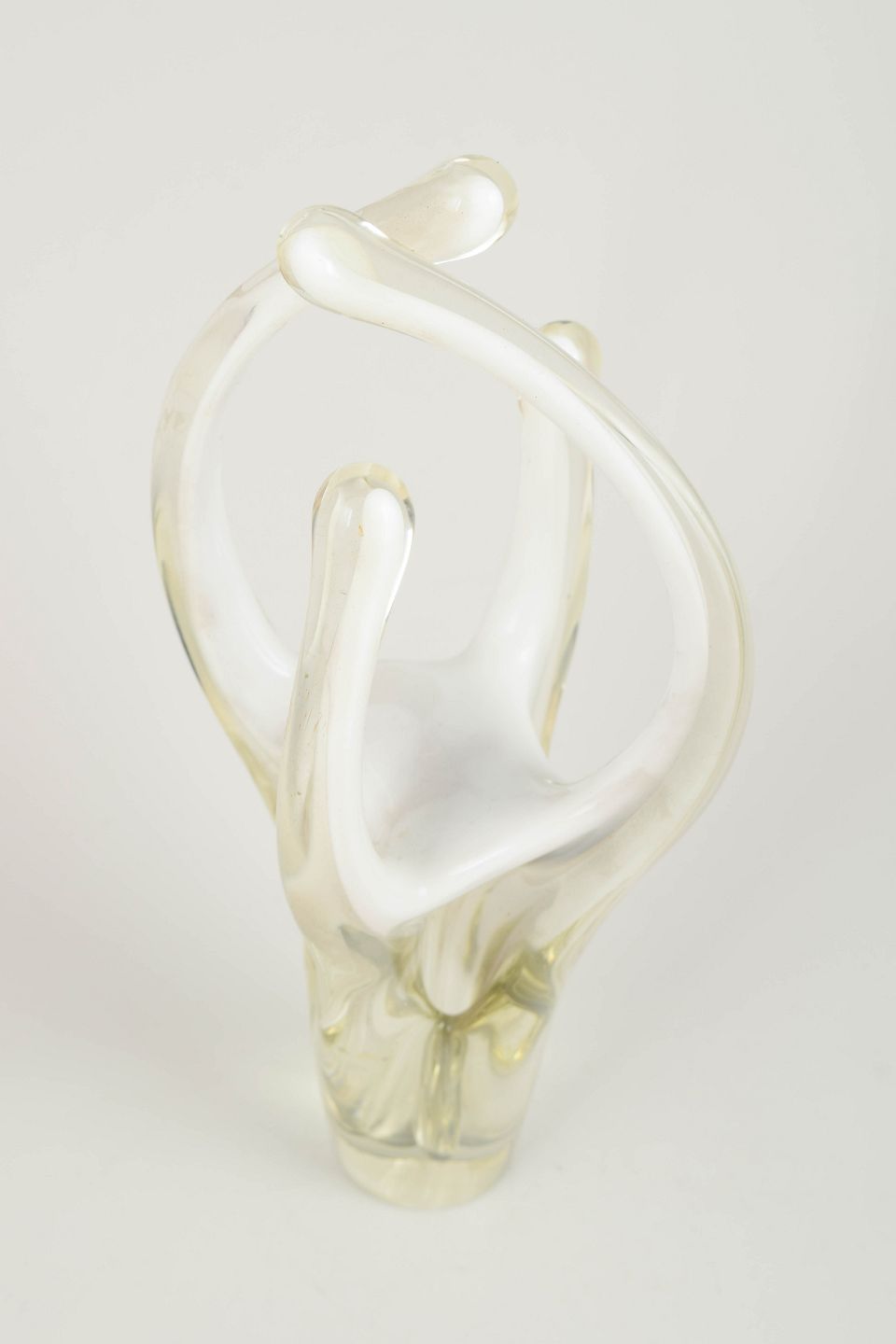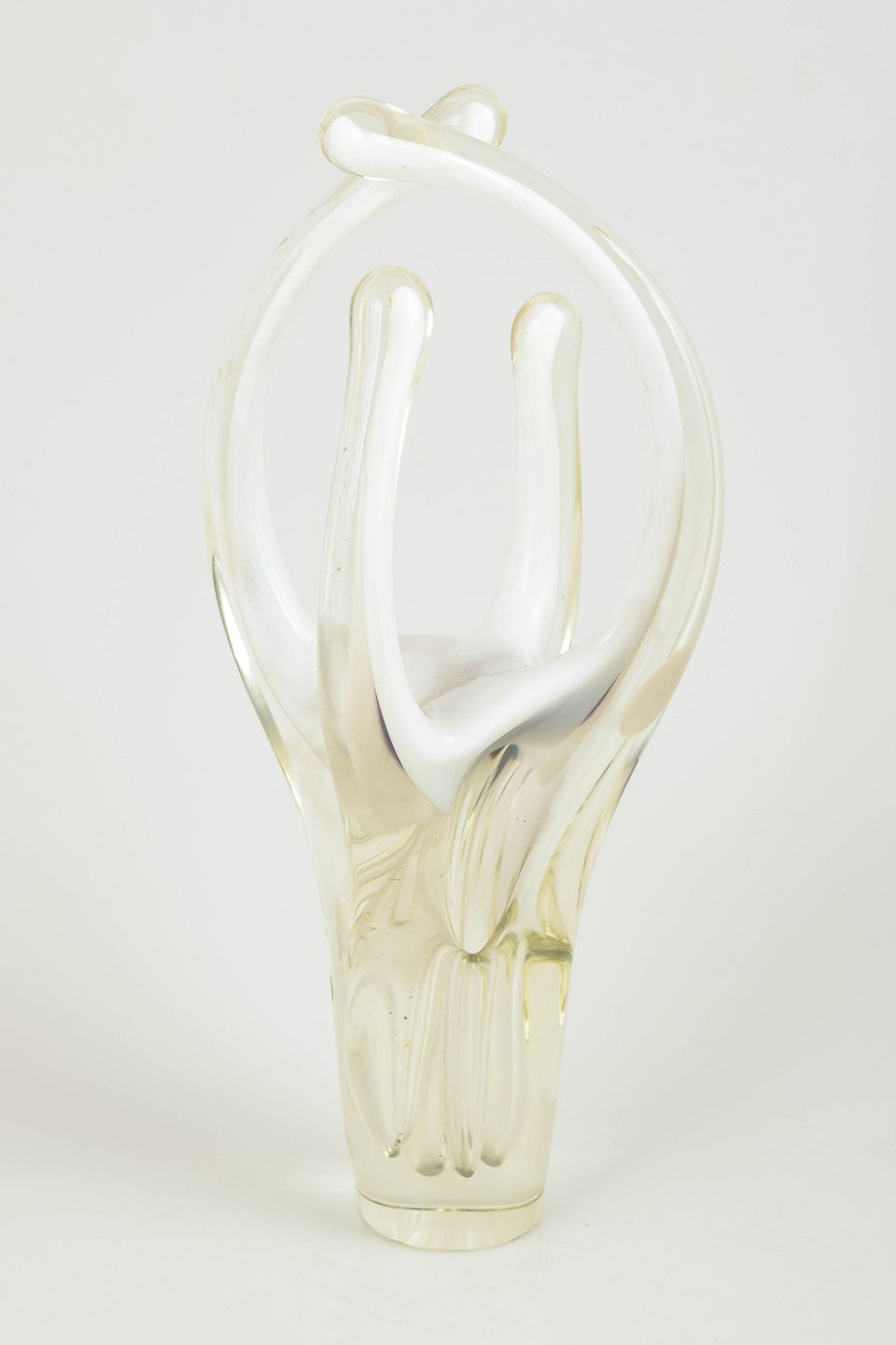 Imponerende fler-armet form i klart kunstglas med let gylden nuance. Den høje, opadstræbende silhuet og de snoede, organiske arme giver et markant, næsten abstrakt skulpturelt udtryk – en sjældnere variation inden for Kedelvs Coquille-arbejder.