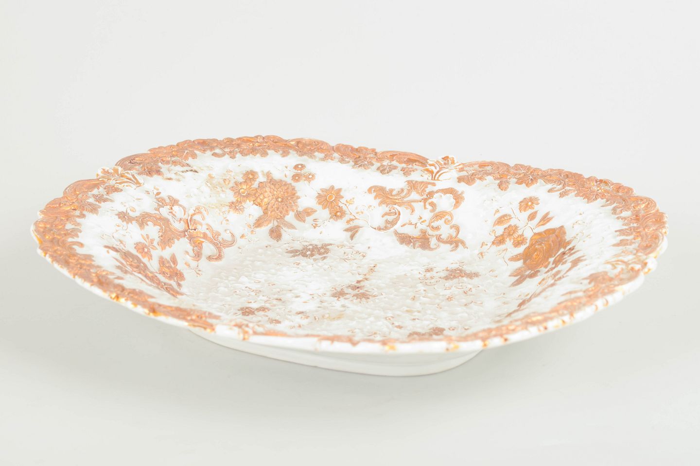 Rectangular porcelain dish by Meissen, richly decorated with rococo-inspired relief borders and extensive hand-painted copper-gold floral ornamentation. The elaborate scrolling and lush motifs give the piece a distinctly late-19th-century opulence.