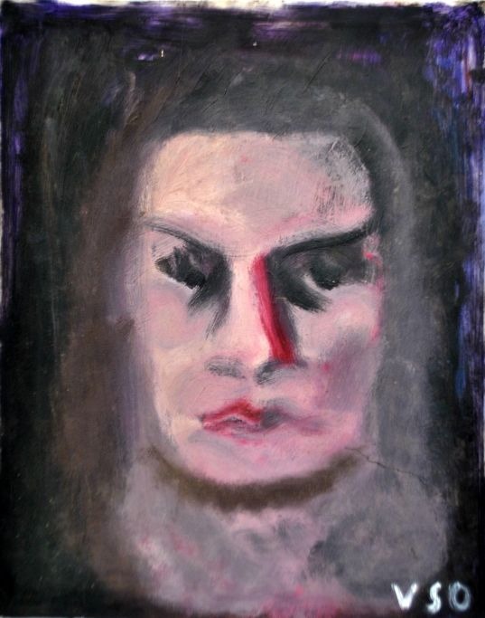 Olsen, William Skotte (1945 - 2005) Danmark: Portræt. Olie på plexi plade. Signeret. Verso ligeledes et  portræt. 50 x 40 cm.