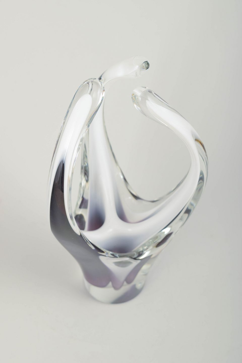 Skulpturel, organisk kunstglas vase i klart glas med smukke lag i violet og hvid. Mundblæst i den klassiske opadstræbende Coquille-form, hvor de to øverste arme mødes i en elegant bue.