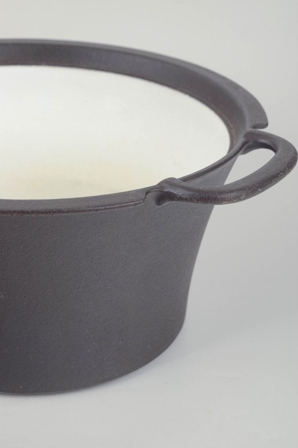 Klassisk formet gryde i sort støbejern med emaljeret inderside og integrerede håndtag. Robust, tung konstruktion, ideel til langtids-simring og ovnretter.