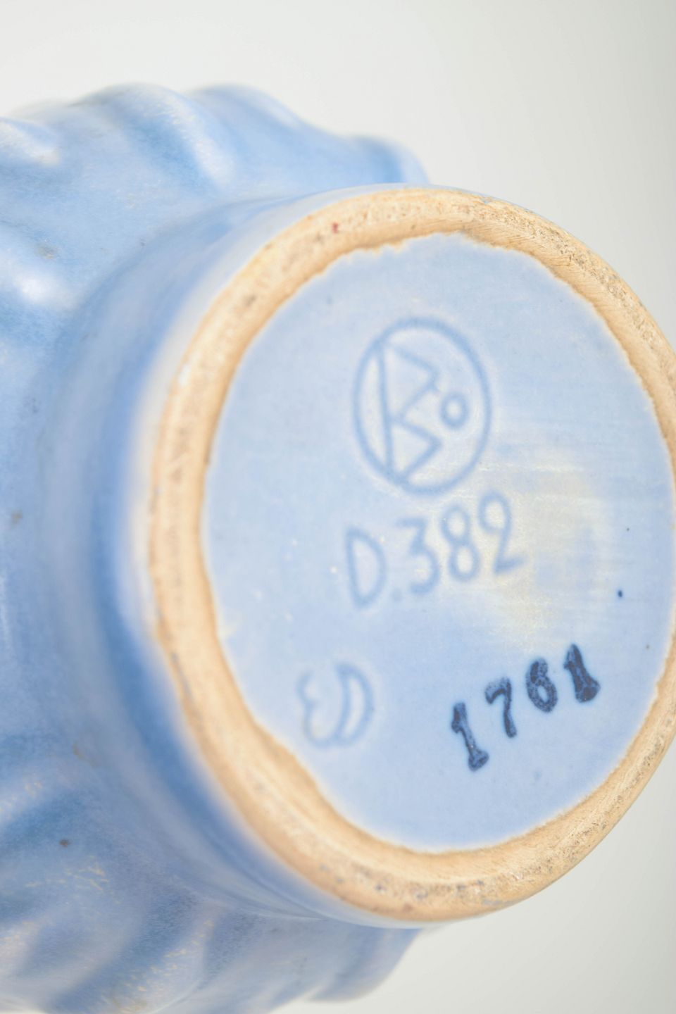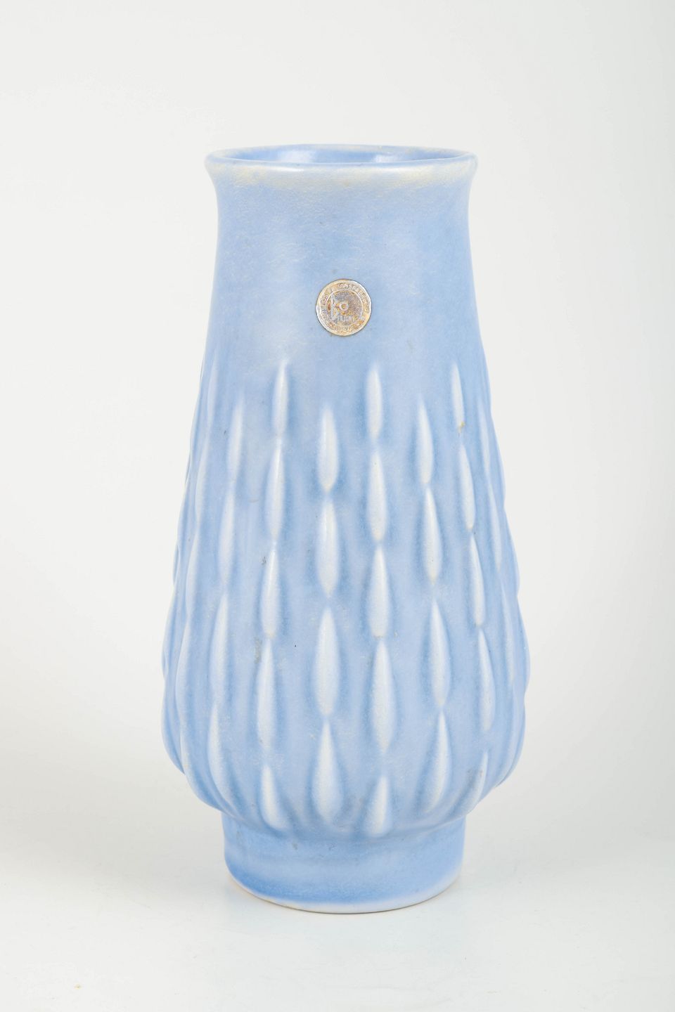 Håndlavet fajancevase i lyseblå glasur med reliefdekoration og original Bo Fajans-etiket bevaret. Model D382. Elegant cylinderisk form med organiske, dråbeinspirerede vertikale mønstre.