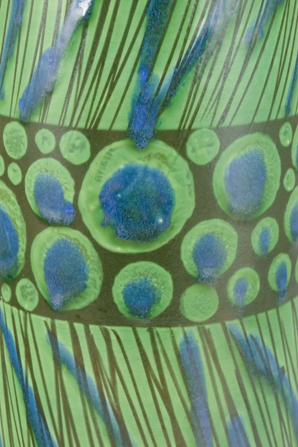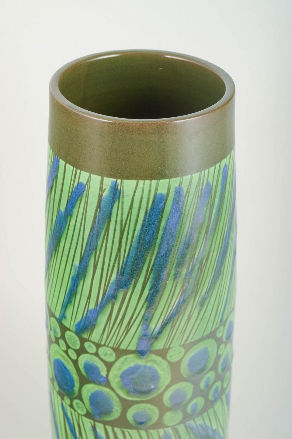 Sjældent, monumentalt keramisk værk af Göran Andersson for Upsala-Ekeby, udført i 1960’erne. Vase i cylindrisk form med levende håndmalet dekoration i grønne og blå nuancer samt et markant bælte af koncentriske cirkler med reliefvirkning. Et unikt stykke fra perioden – både i størrelse, udtryk og kunstnerisk kvalitet.