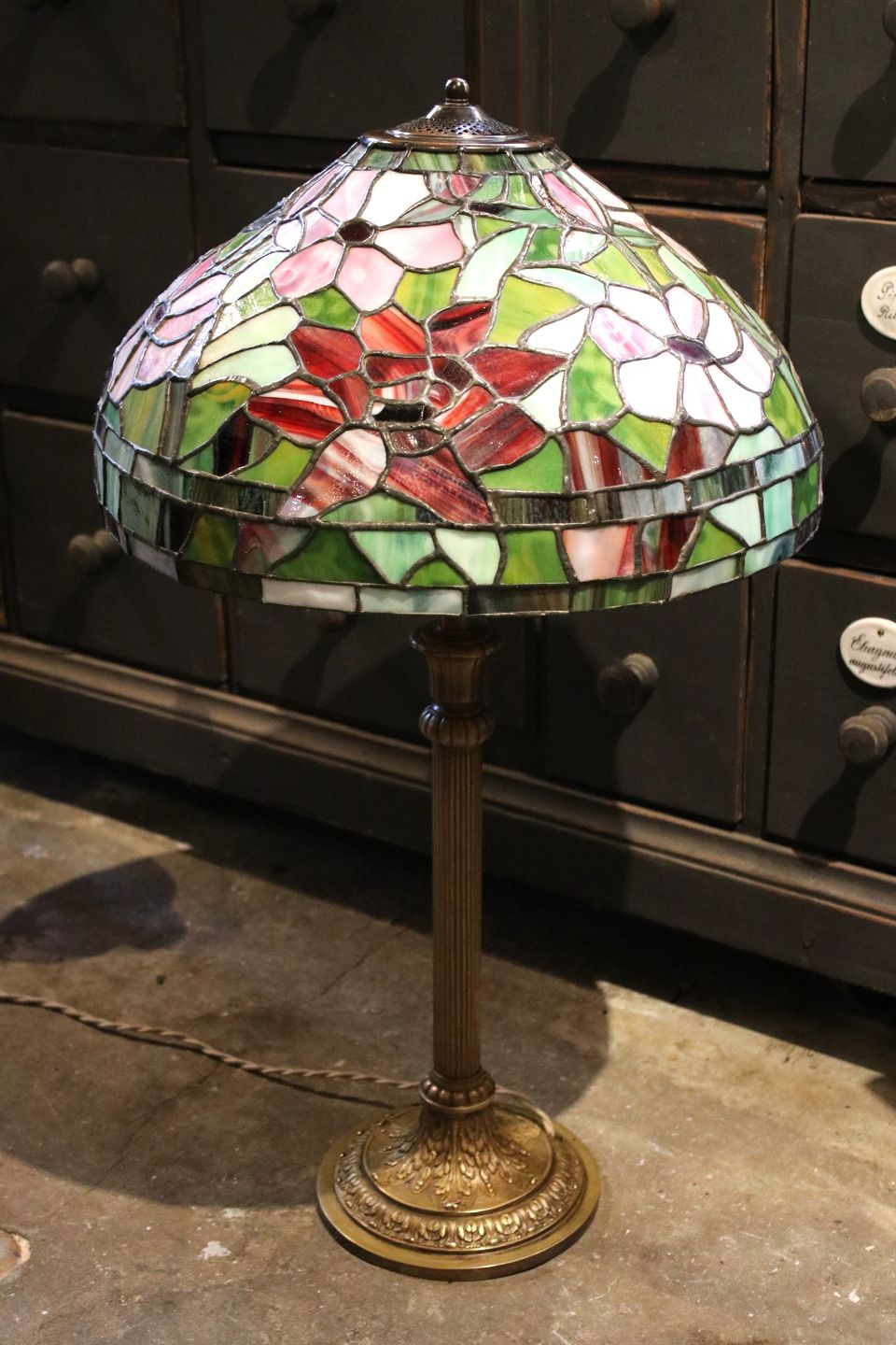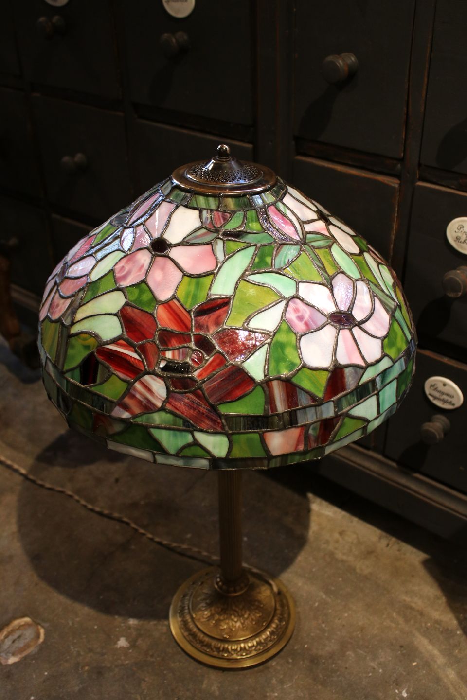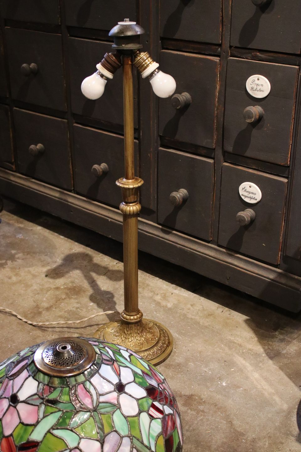 Decorative, old Tiffany table lamp from the 40s. with glass shade in colored floral motif and bronze base. H: 75cm. Dia.: 42cm.