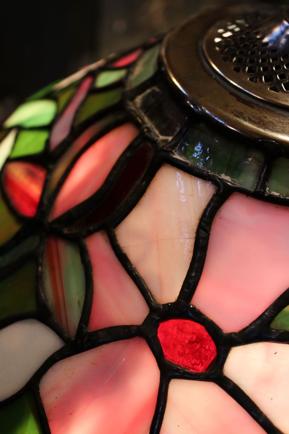 The lamp has 2 light sources and is mounted with a brand new twisted fabric cord. (There is a small hairline crack in one of the mosaic glass, see extra picture!)