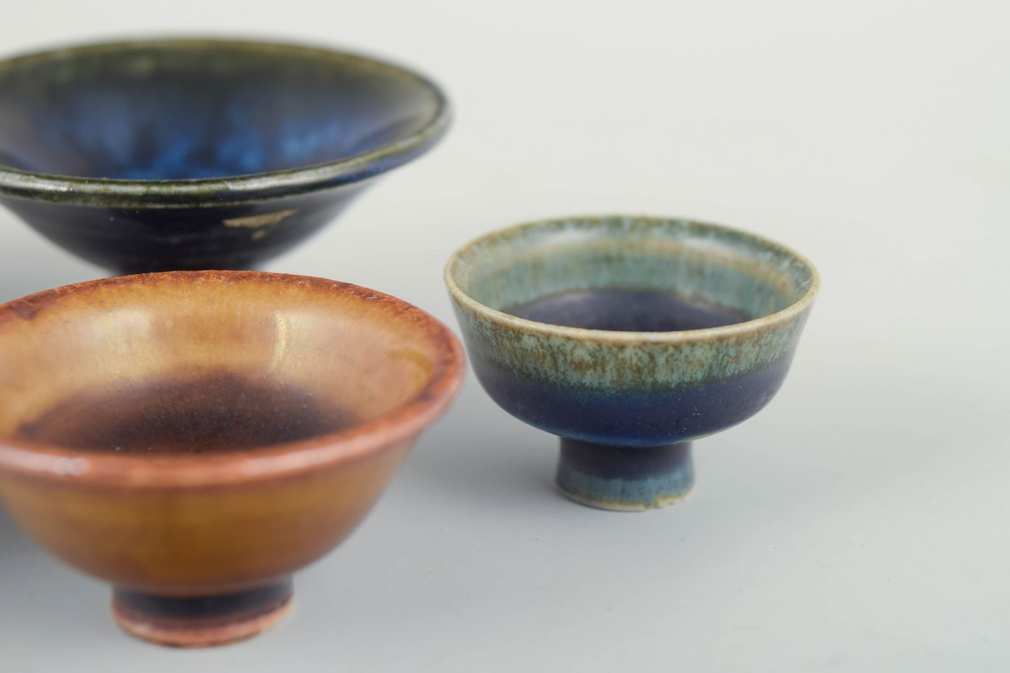 Et dekorativt sæt med seks hånddrejede miniature stentøjsskåle, hver med individuelt formudtryk og varierede glasurer i blå, grønne og brunlige toner. Et charmerende eksempel på svensk studiokeramik i lille skala.
