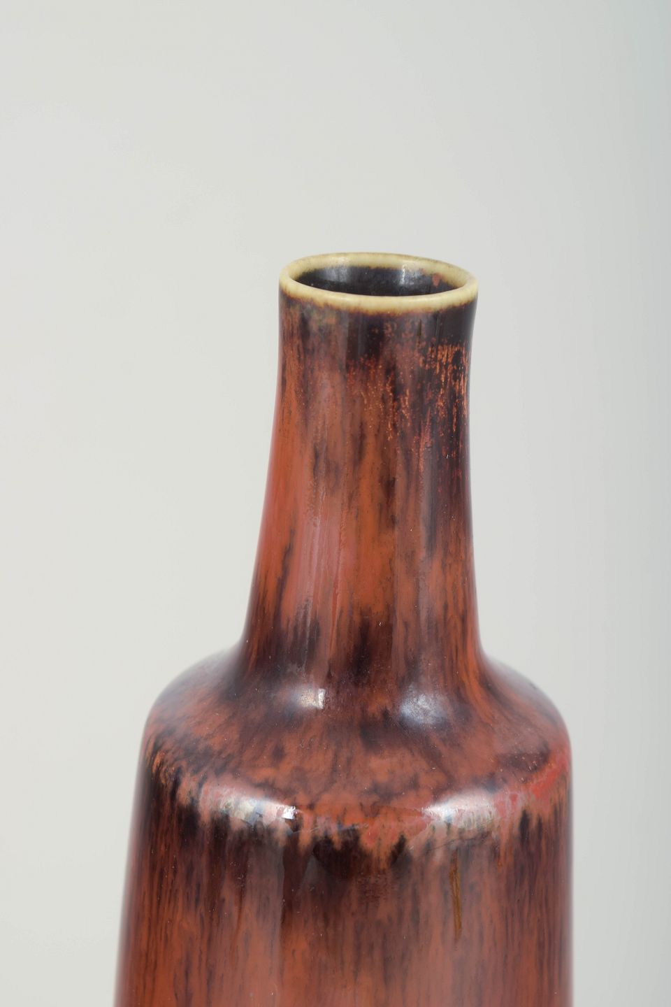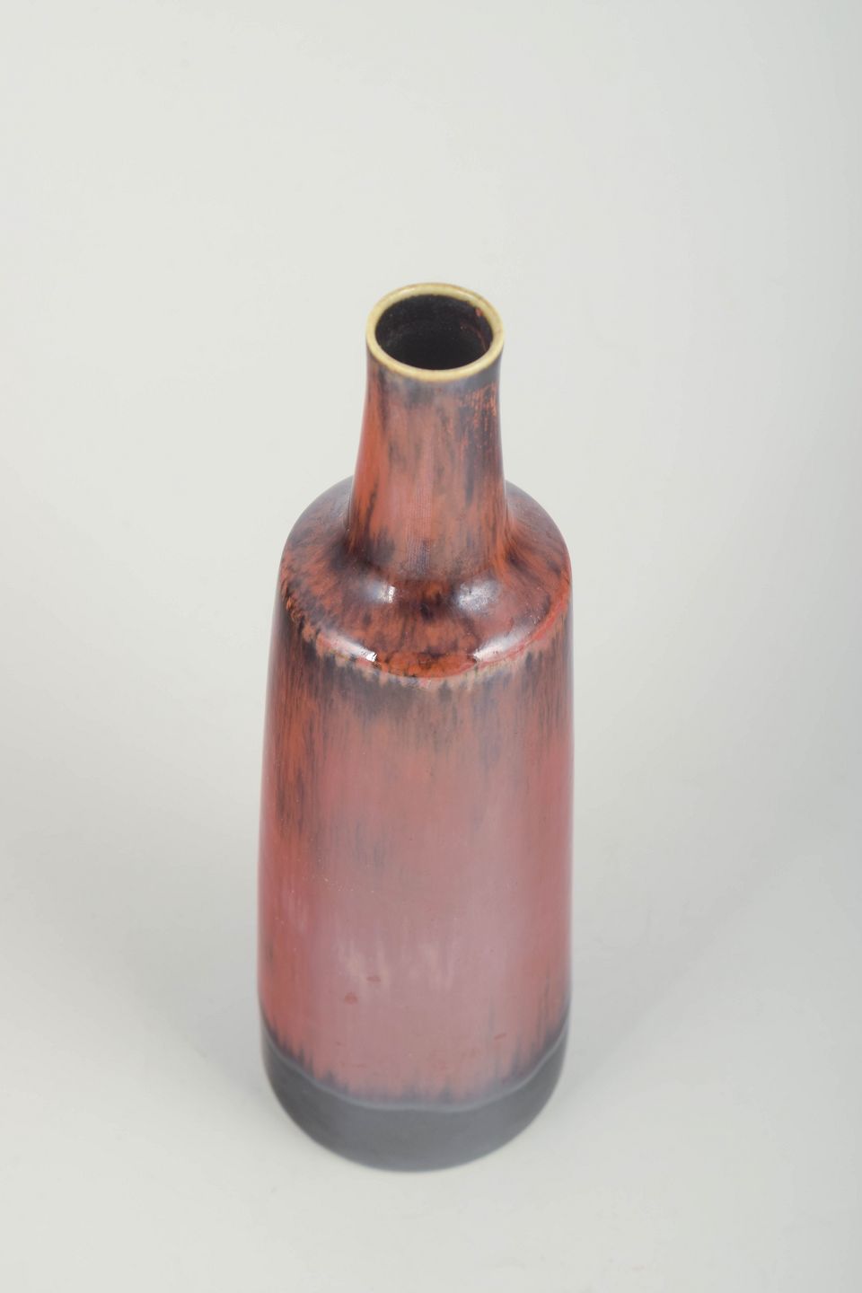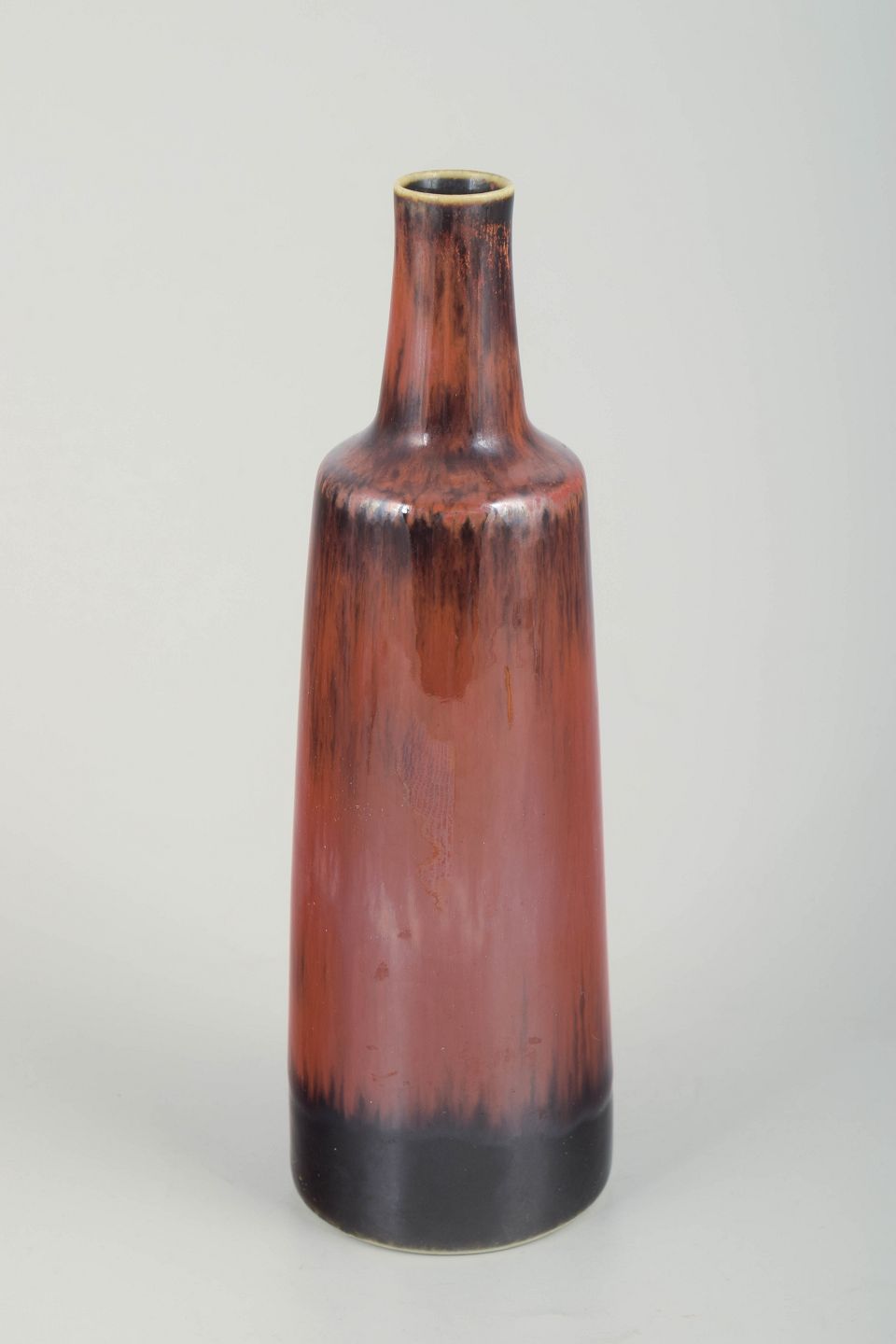 Elegant, cylindrisk vase i stentøj med smal hals og karakteristisk rødbrun glasur med mørke løbende toner mod foden – et typisk eksempel på Stålhanes raffinerede formsprog og glasurarbejde.