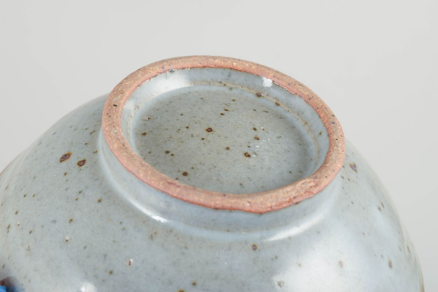 Unik skål i kinesisk-inspireret stil med dekorativ relief- og penselmalet dekoration samt lys celadonlignende glasur og rødlig kant. Signeret.