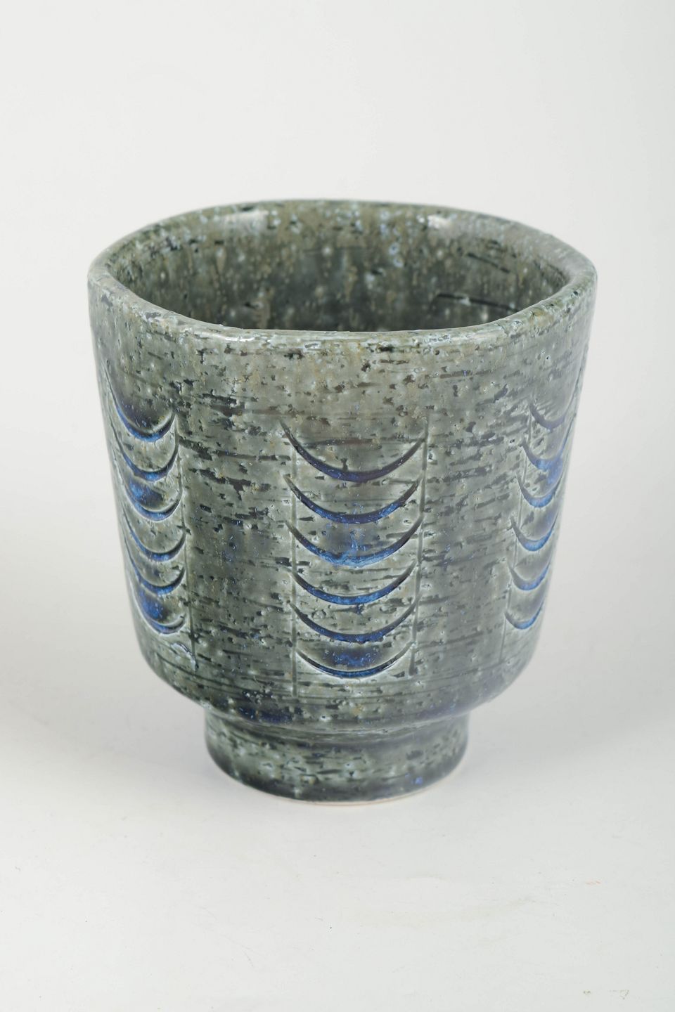 Lille cylindrisk vase i stentøj med indskårne buemotiver i blå nuancer og karakteristisk Palshus askeglasur. Signeret.