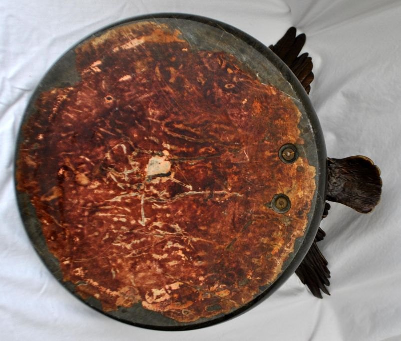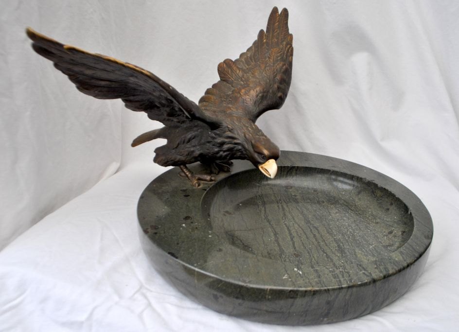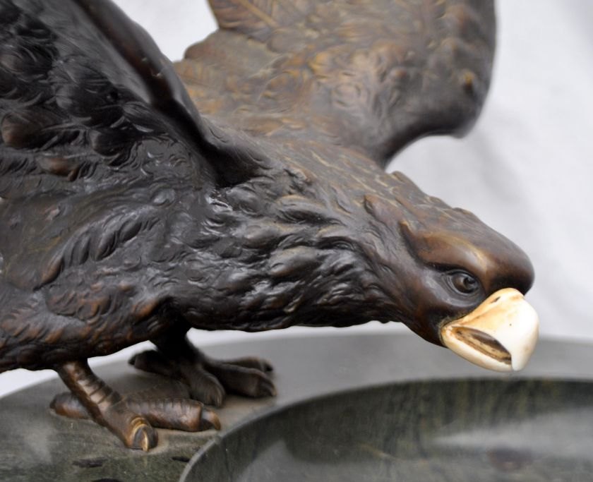 Stor fransk bronzeørn monteret på marmorfad, art nouveau, ca. 1900. Ørn med udbredte vinger og næb af elfenben. Grønt marmorfad. Fad dia: 35 cm. Ørn: B: 40 cm. H.: 23 cm.