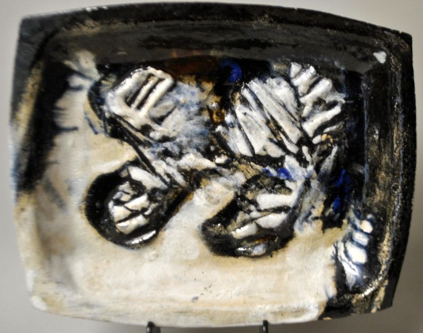 Hagedorn-Olsen, Jeppe (1929 - 2011) Danmark: Fad. Glaseret lertøj. Glasur i hvidt, blåt og sort. Signeret. 29 x 23 cm.