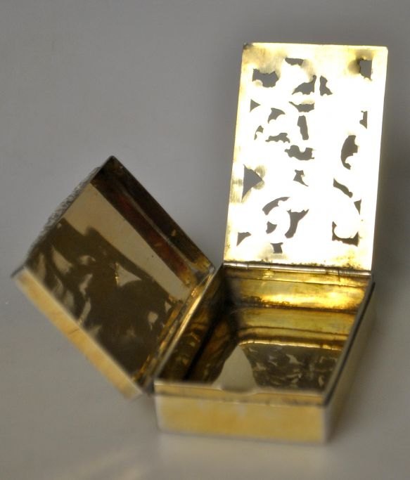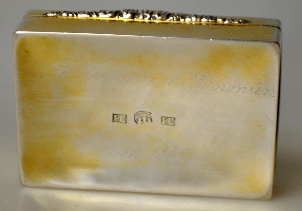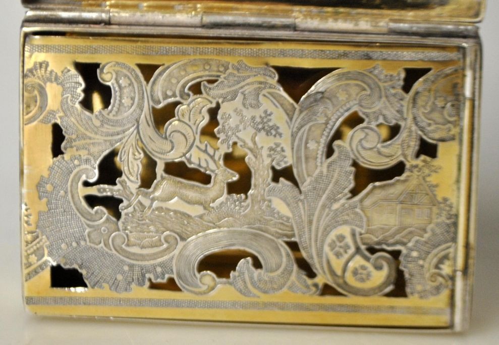 Peter Erichsen (1826 - 1869) Haderslev, Danmark: Lugtedåse i sølv. Stemplet med mestermærke og byvåben. Indvendig lueforgyldt og gitter med rococo mønstre med springende hjort, hus og træer. 6,5 x 4,5 x 1,8 cm. Vægt: 54 gram.