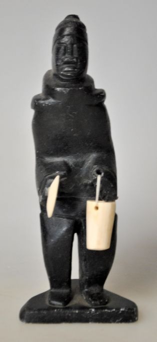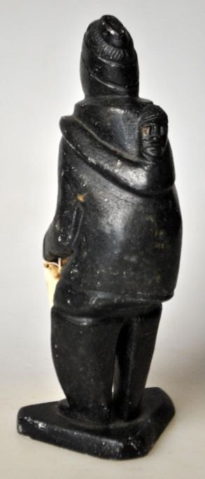 Grønlandsk fedststensfigur af kvinde med barn og ulut, 20. årh. Udformet af E. M. Petersen, Paamiut (Frederikshåb). H.: 13 cm.