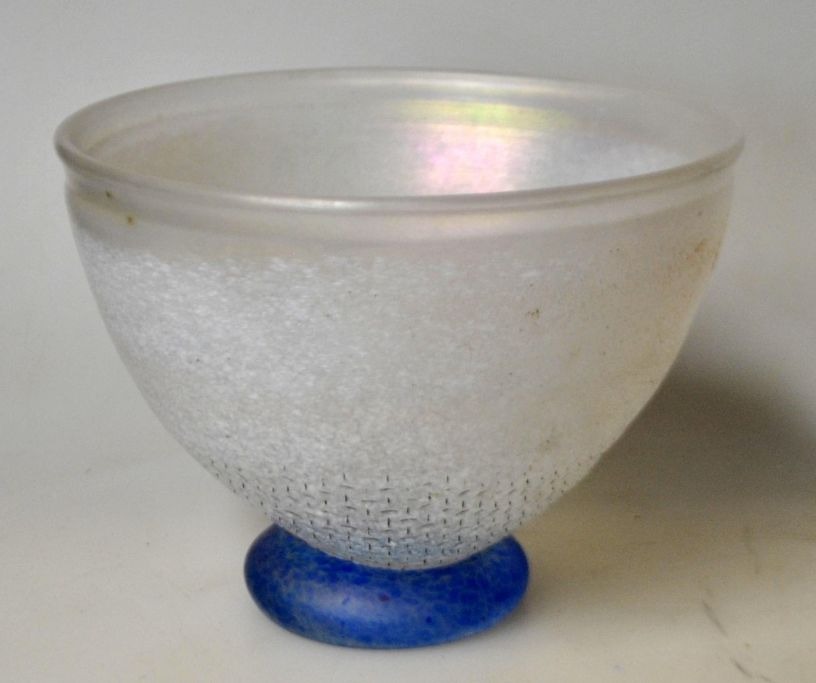 Kosta Boda "Network" skål no. 57863, Design: Bertil Vallien, 1978, Sverige. Frosted glas med net design på blå fod. Signeret. H: 8,5 cm. Dia: 11 cm.