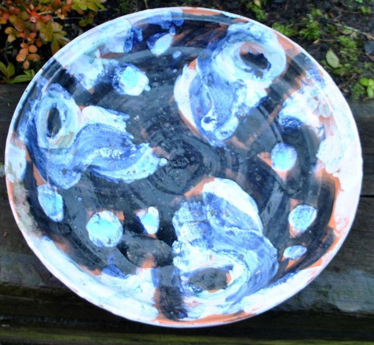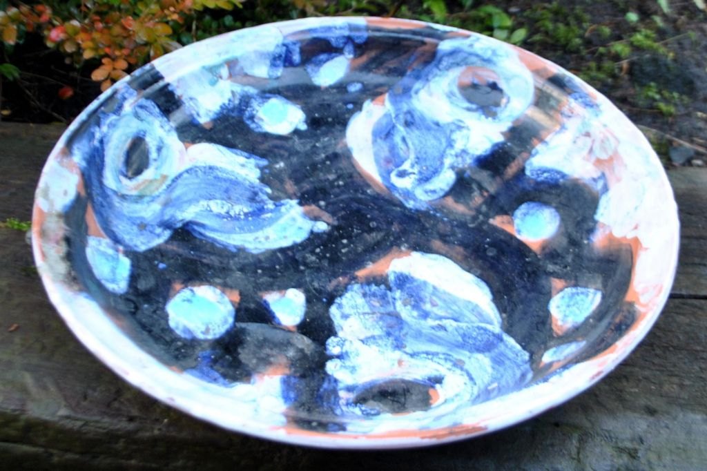 Glud, Jørgen (1913 - 2003) Danmark: keramik fad, 1980. Rødler. Glasur i sort, blå, hvid og grøn. Signeret: J.G. 80. Dia: 37 cm.