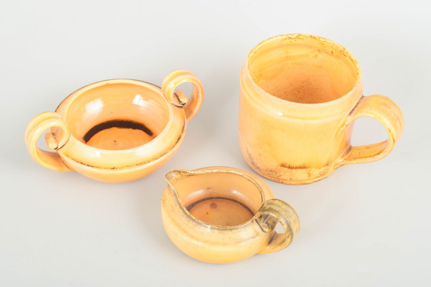 Three pieces in the classic warm yellow-orange Kähler glaze of the 1930s. The set includes a small creamer with decorative curved handle, a sugar bowl with twin spiral handles, and a larger mug/cup with pronounced handle. Attractive proportions and characteristic handcrafted styling.