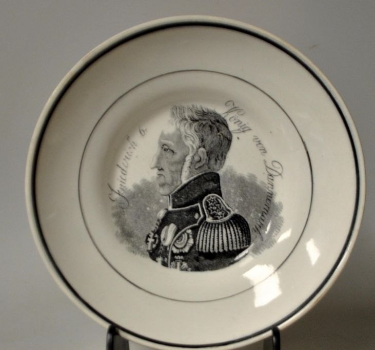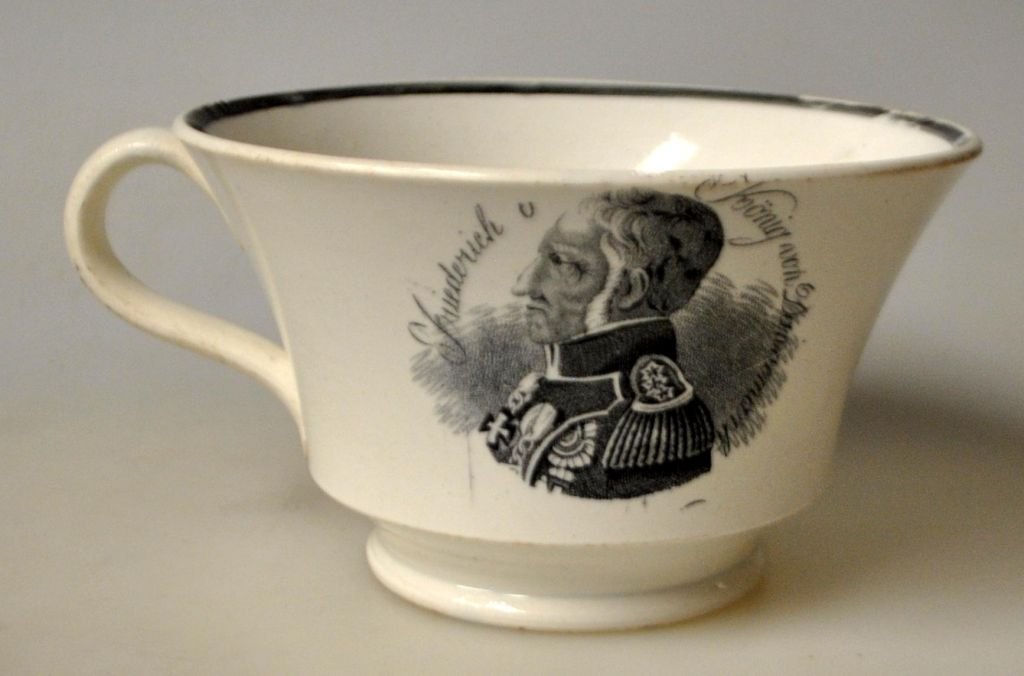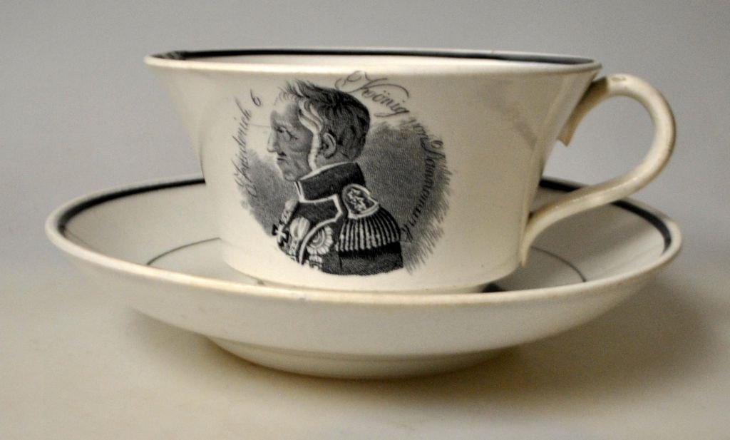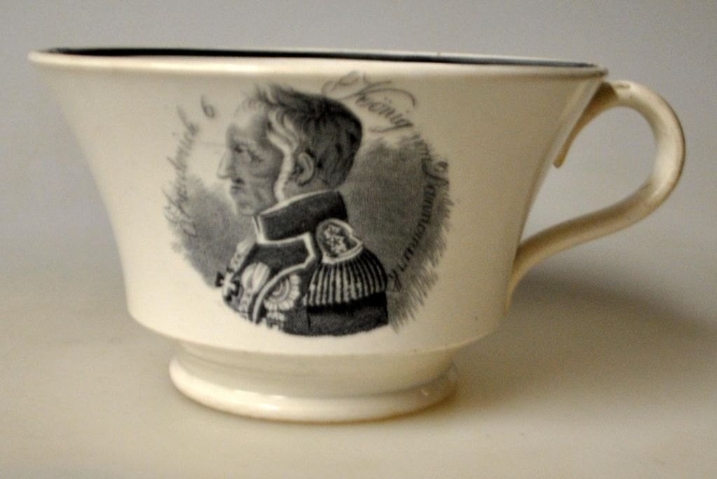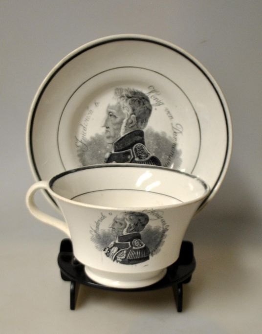 Kaffekop med underkop, fajance, 19. årh. Med kong Frederik VI's portræt og tekst på tysk