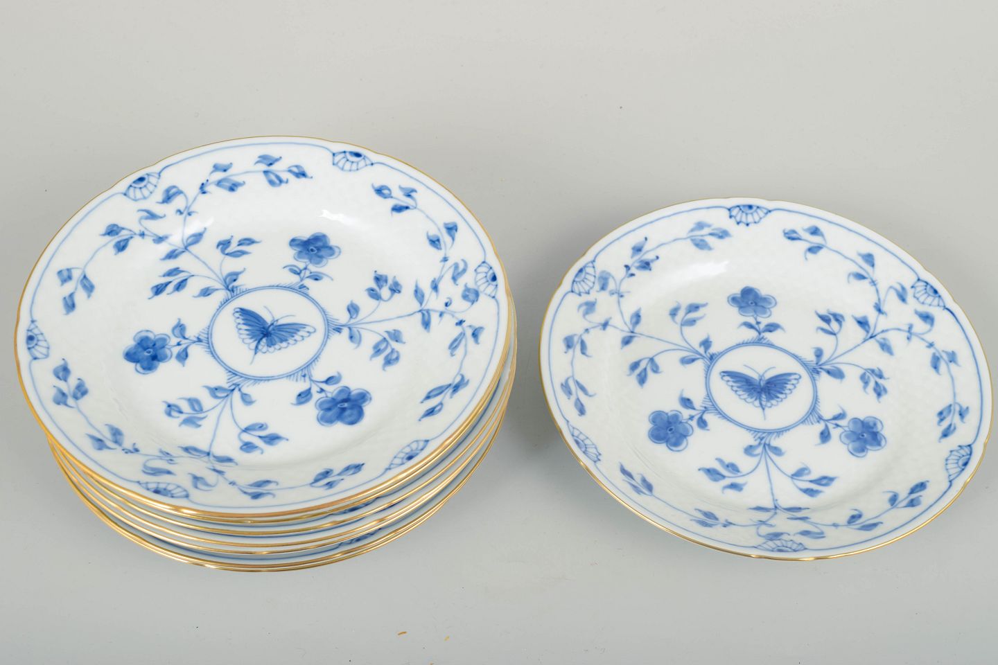 Beautiful set of eight dessert plates featuring the hand-painted butterfly motif with blue floral decoration and an elegant gold rim.