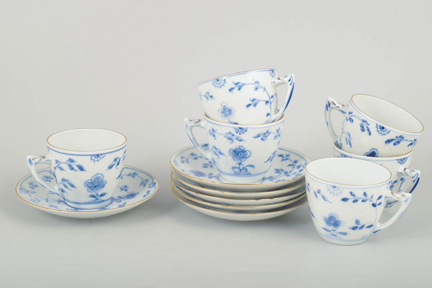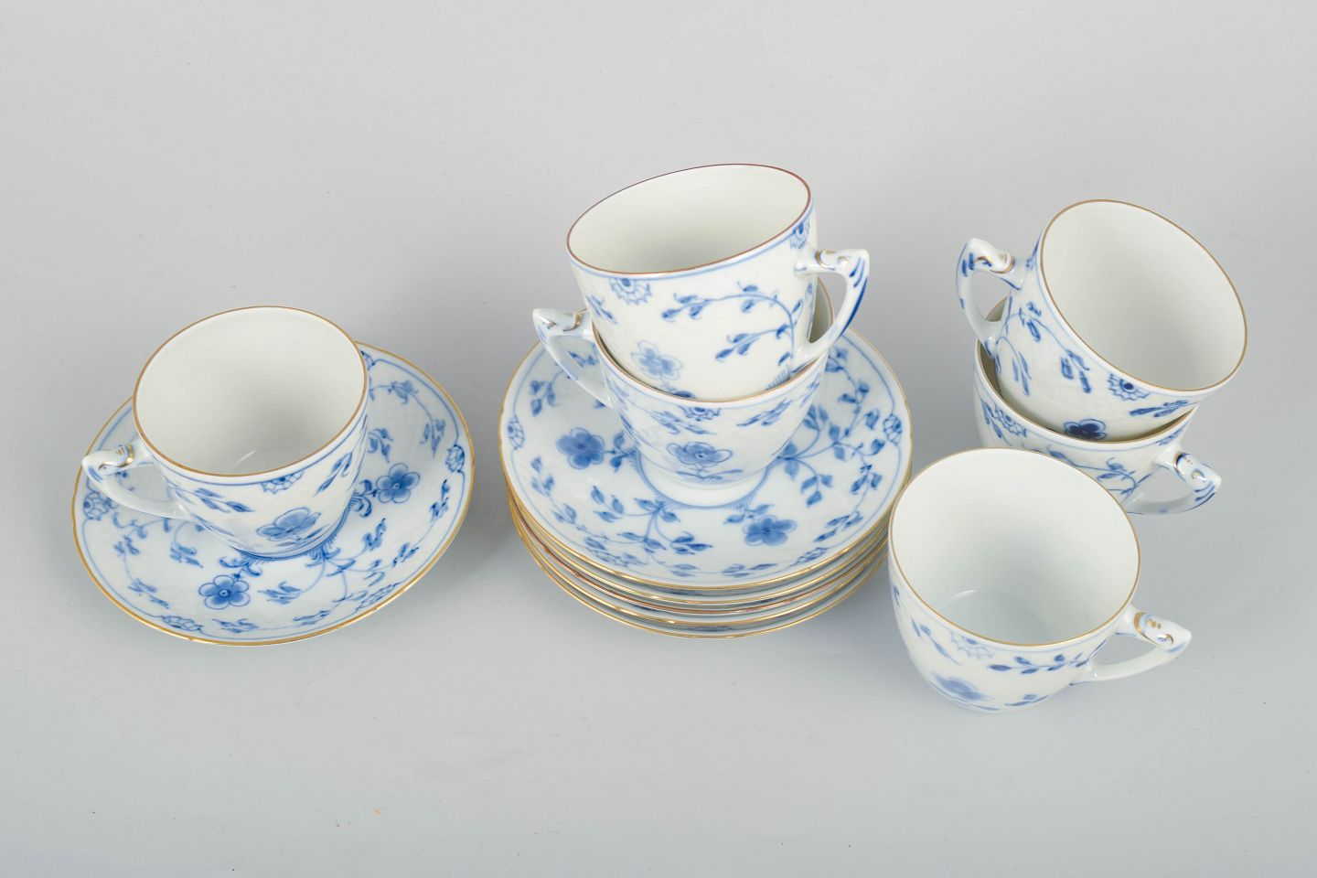 Set of six coffee cups with saucers in the classic hand-painted Kipling pattern, gold decor. The cups feature the characteristic blue floral motifs on white porcelain.
