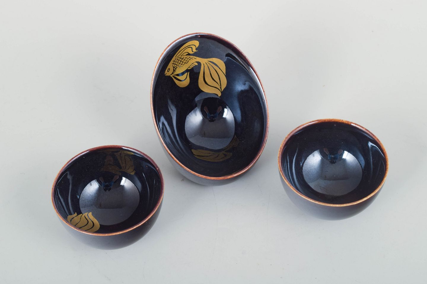 Tre små håndglaserede skåle i dyb blå glasur, hvoraf én dekoreret med et elegant guldfarvet fiskemotiv. Klassisk Gustavsberg-æstetik i miniatureformat.