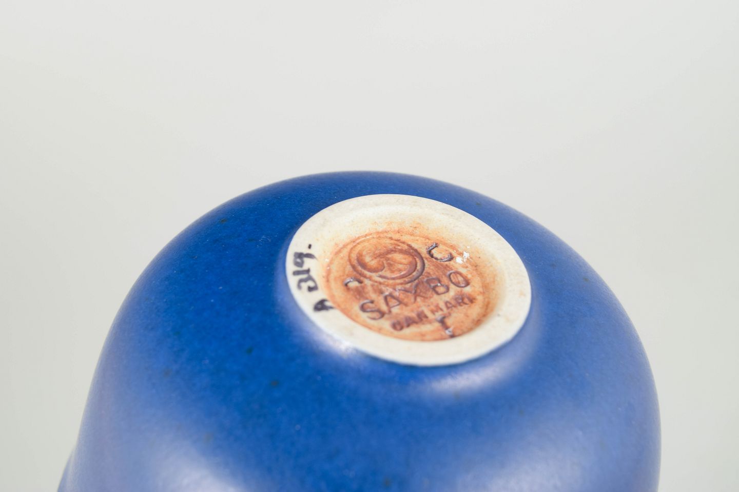 Elegant marmeladekrukke i klassisk Saxbo-stentøj med dyb blå glasur, Hans Hansen sterlingsølvlåg (1934) og Hans Hansen 830 sølvske.