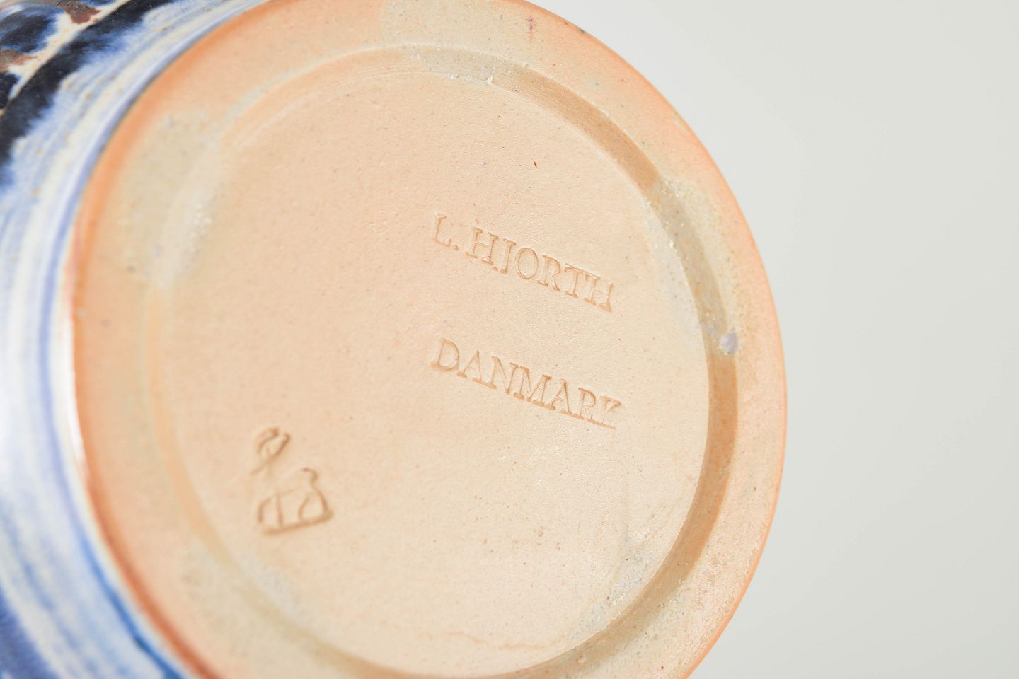 Founded in 1859, L. Hjorth’s Terracotta Factory is one of Bornholm’s most significant ceramic workshops. By the mid-20th century, the studio had developed a strong stoneware tradition characterised by hand-thrown forms, rich glazes, and intricately textured decoration. These pieces are now valued for their artistic quality and exceptional craftsmanship.