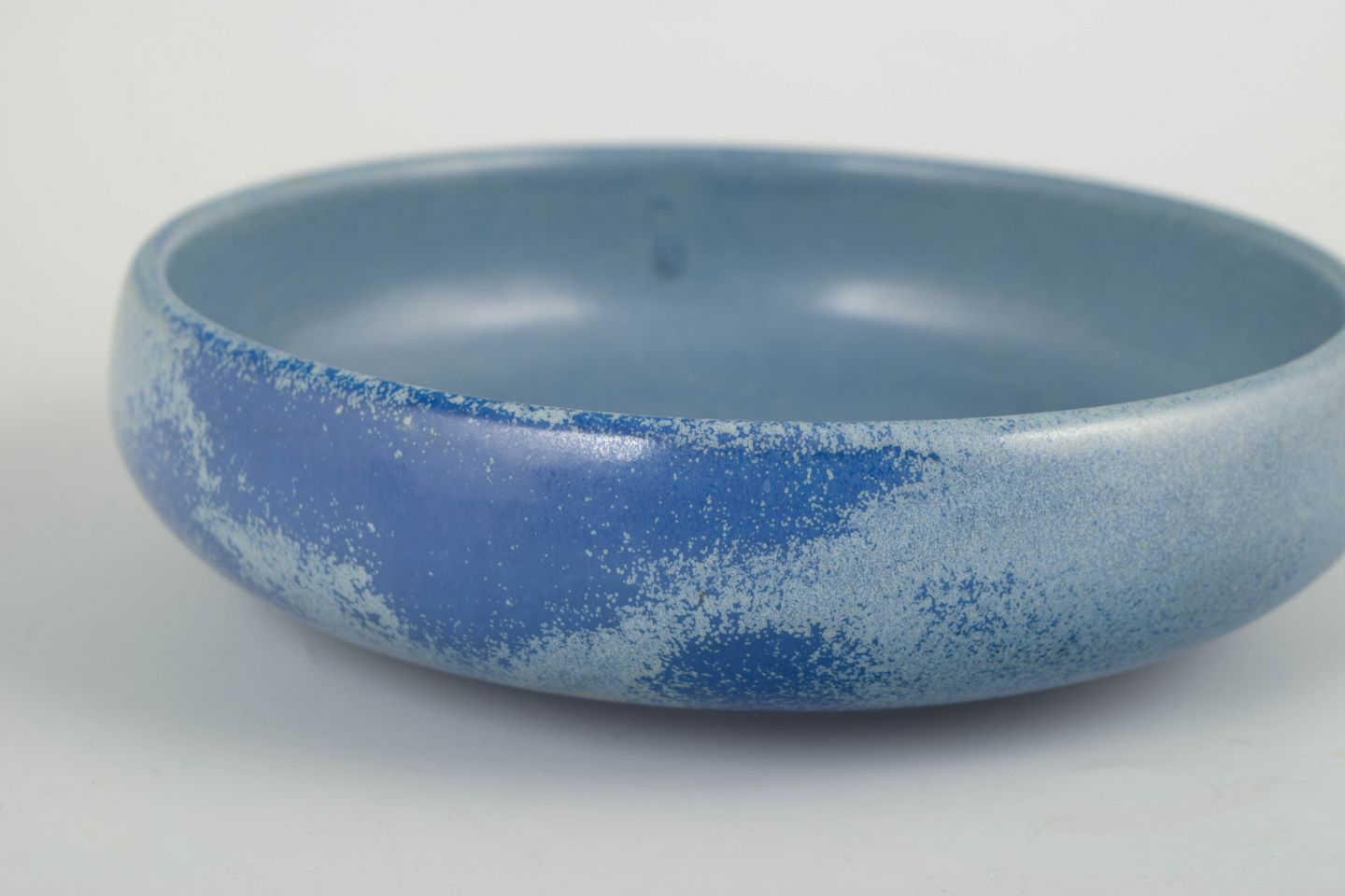 Hand-thrown stoneware bowl in a low, rounded form with a matte blue glaze in gently varied tones, characteristic of Hjorth’s experimental surface treatments of the period.